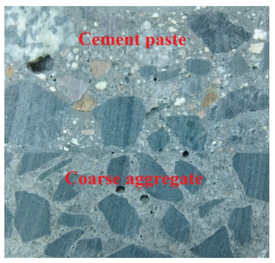 At the early stage, the concrete matrix remains highly fluid, and continuous vibration promotes the redistribution of cement paste and fine particles around coarse aggregates, effectively filling micro-voids and expelling entrapped air, thereby enhancing the overall compactness of the concrete [,]. Meanwhile, due to the low cohesiveness of high-slump concrete, segregation tends to occur during vibration, causing the paste to separate from the coarse aggregates in the upper region and locally increasing the water–cement ratio (as shown in Figure 11). This condition accelerates the evaporation of surface water and effectively reduces the actual water–cement ratio of the entire system, further promoting the development of early compressive strength. Therefore, vibration-induced paste densification, microstructural rearrangement, and the reduction in the effective water–cement ratio collectively dominate the early strength enhancement, enabling the vibrated specimens to exhibit a significant strength advantage at 1 day, with the positive effects outweighing the adverse influence of initial segregation.