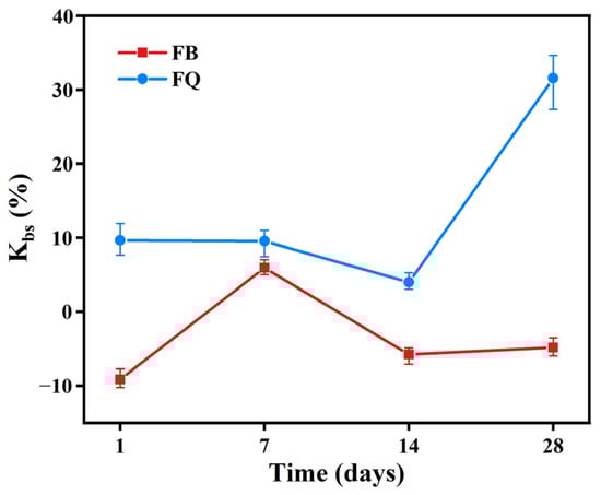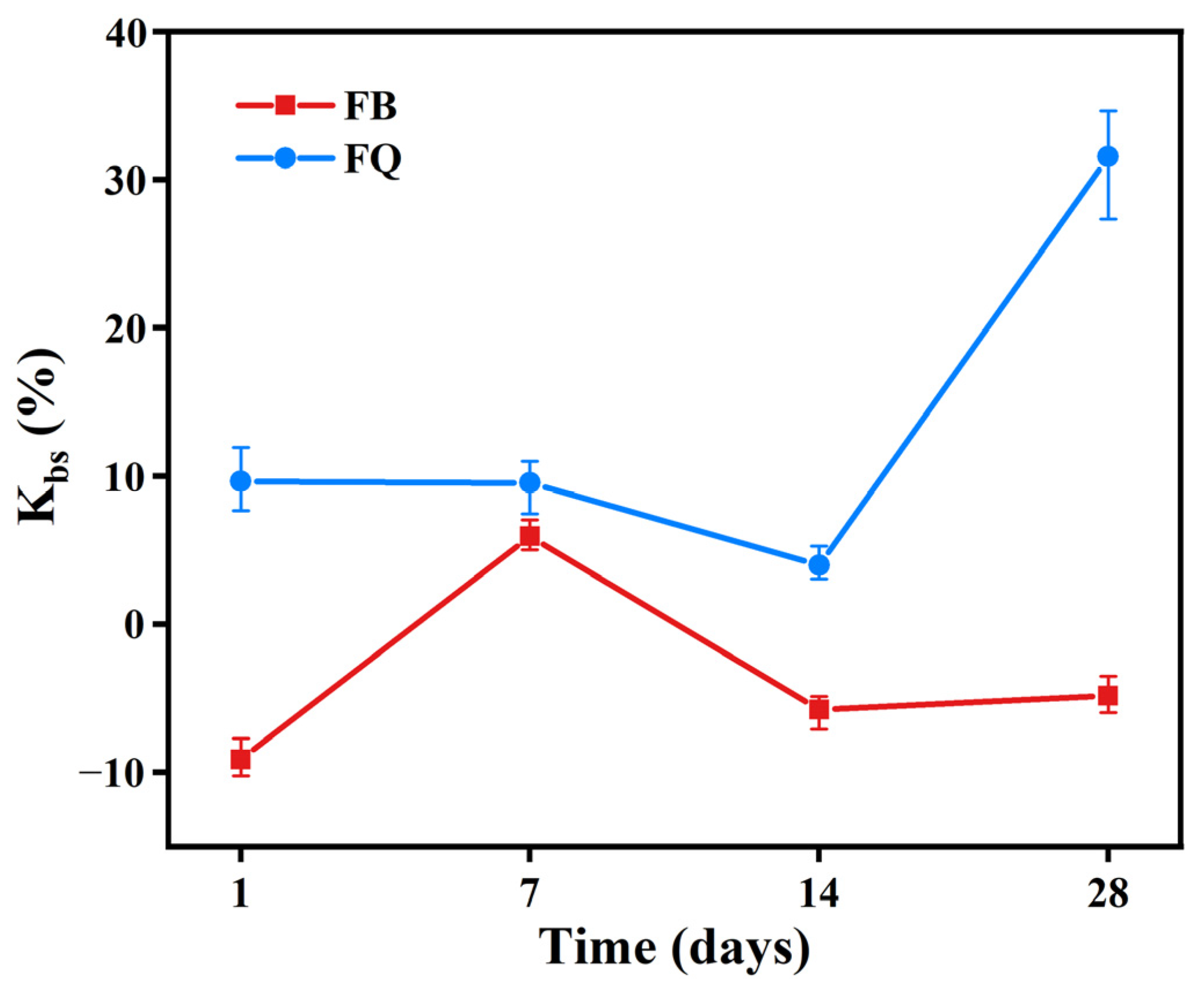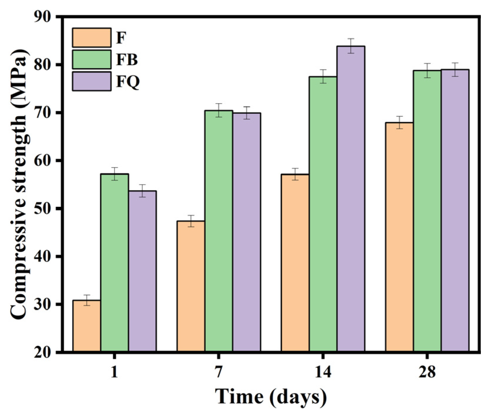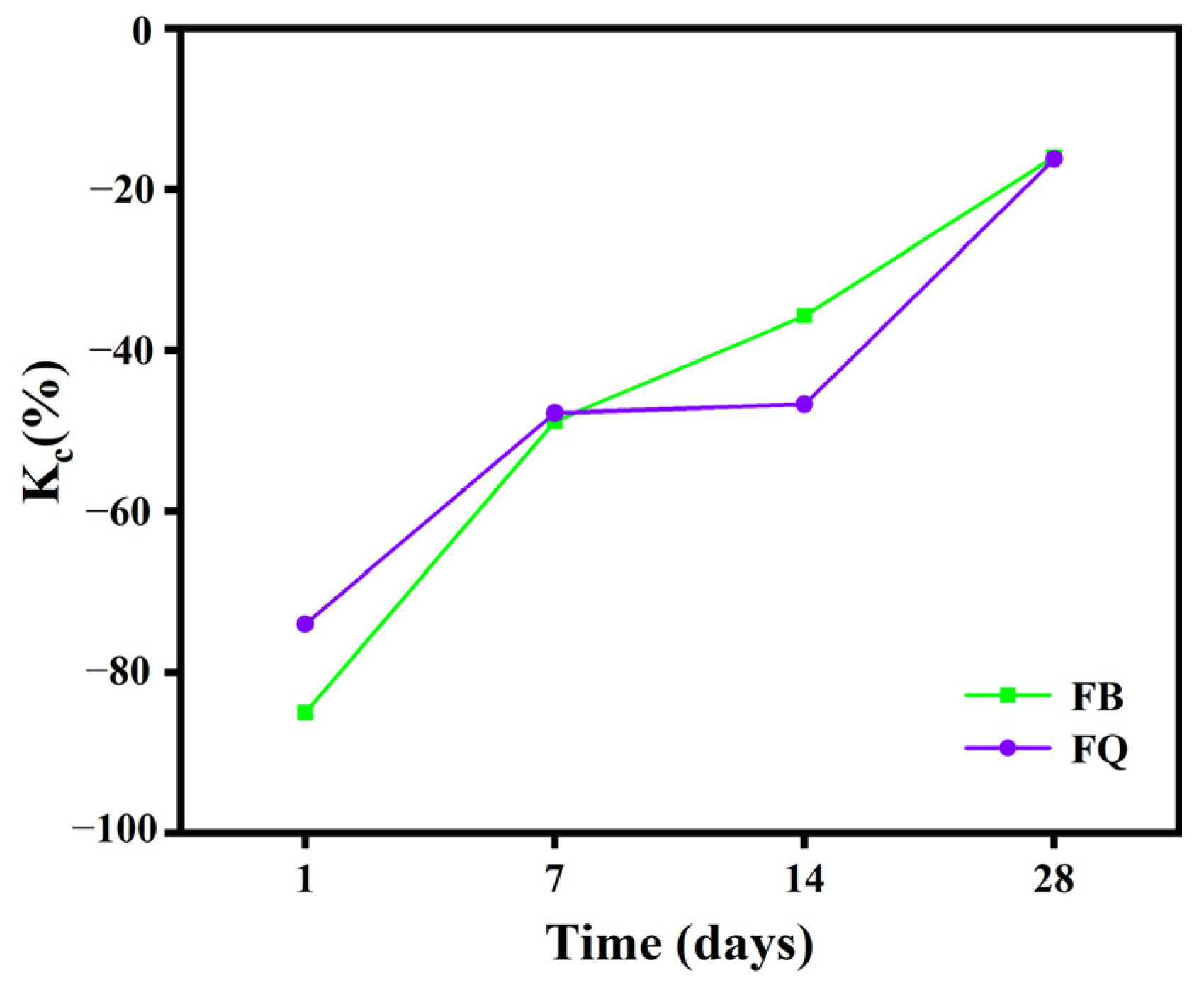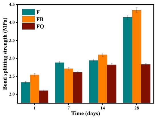 At the 28-day curing age, the bond-splitting strength of group FB increased significantly, with a disturbed coefficient of −5.8%. At this time, the cement hydration reaction is nearly complete, and the microstructure of the cement paste has stabilized. Vibration effectively removes internal bubbles and voids in the concrete, enhancing the bond strength between cement and aggregate, thus improving the bond-splitting strength. In contrast, the bond-splitting strength of group FQ did not show a significant increase at 28 days, and its disturbed coefficient reached as high as 32.8%. This is because vibration before initial setting in this mode caused structural defects in the cement hydration products, limiting the later growth of bond-splitting strength. Moreover, long-duration vibration cause some paste loss or uneven cement hydration, suppressing further strength development and resulting in insufficient bond strength at the interface between new and old concrete in later stages [].