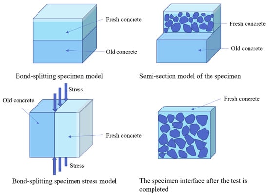 The failure mechanism model of the concrete bond-splitting test specimen is shown in Figure 14. The bond-splitting specimen model demonstrates the actual bonding condition between new concrete on the upper layer and old concrete on the lower layer, reflecting real engineering situations. The half-section view of the specimen clearly shows the distribution of coarse aggregates in the new concrete, helping to understand the structural influence on bond performance. The stress model illustrates the stress applied vertically to the interface between new and old concrete during the test, simulating the actual loading condition. The post-test interface image shows the distribution of coarse aggregates in the new concrete and possible failure features.