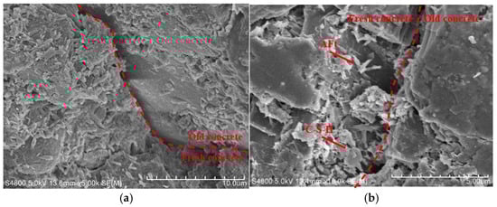 Microstructure of fresh-to-old interface of concrete with vibration from concrete casting to the final setting stage: (a) 5000 times SEM image; (b) 10,000 times SEM image. Legend: The red dashed line in the figure is used to indicate the fresh-to-old interface.