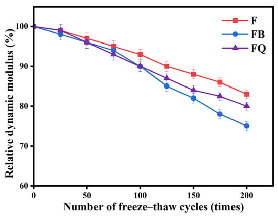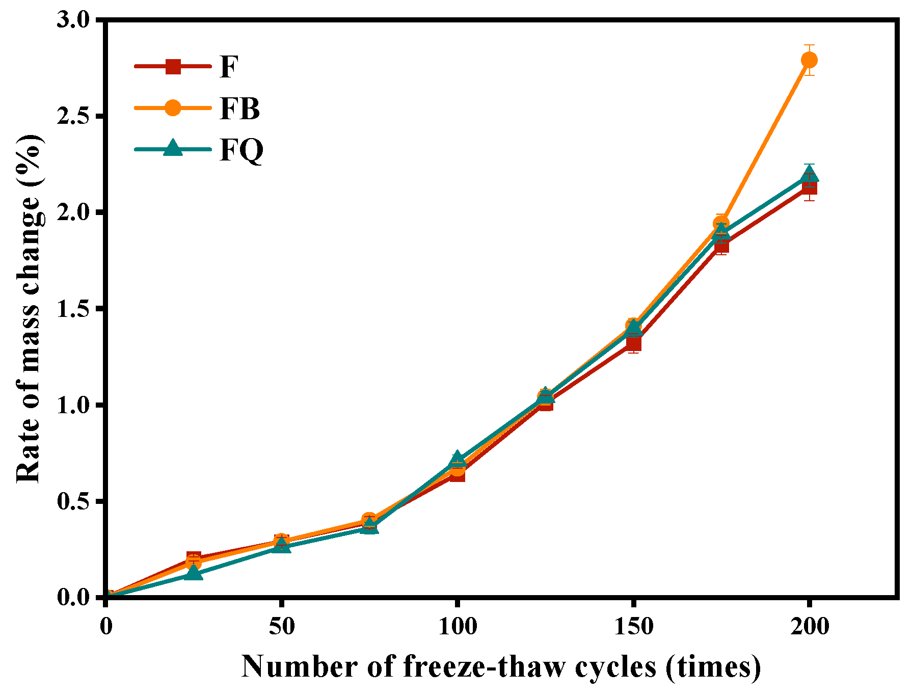 The change in mass loss rate of concrete in groups F, FB, and FQ under different freeze–thaw cycles is shown in Figure 17. Group F, without vibration, has a relatively stable initial structure. With the freeze–thaw cycles, repeated freezing and thawing of pore water causes a gradual increase in mass loss rate, reaching 2.1% after 200 cycles. Group FQ, vibrated throughout the entire process, disturbs the structural uniformity to some extent. Its mass loss trend is similar to group F, but the mass loss rate after 200 cycles is slightly higher than group F. In contrast, group FB shows no significant difference in mass loss rate from the other two groups in the early freeze–thaw cycles. However, in the later stage (cycles 175–200), its mass loss rate sharply increases, reaching 2.8% after 200 cycles. This is because vibration from initial to final setting causes more microcracks in the semi-solid concrete with poor bonding, creating weak points inside the concrete. As freeze–thaw cycles increase, these microcracks expand and connect more easily under pore water pressure, accelerating structural damage and causing much higher mass loss than groups F and FQ. This highlights the significant difference of group FB in later freeze–thaw cycles.