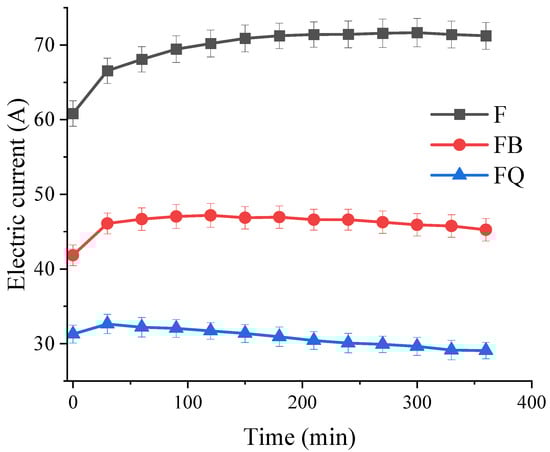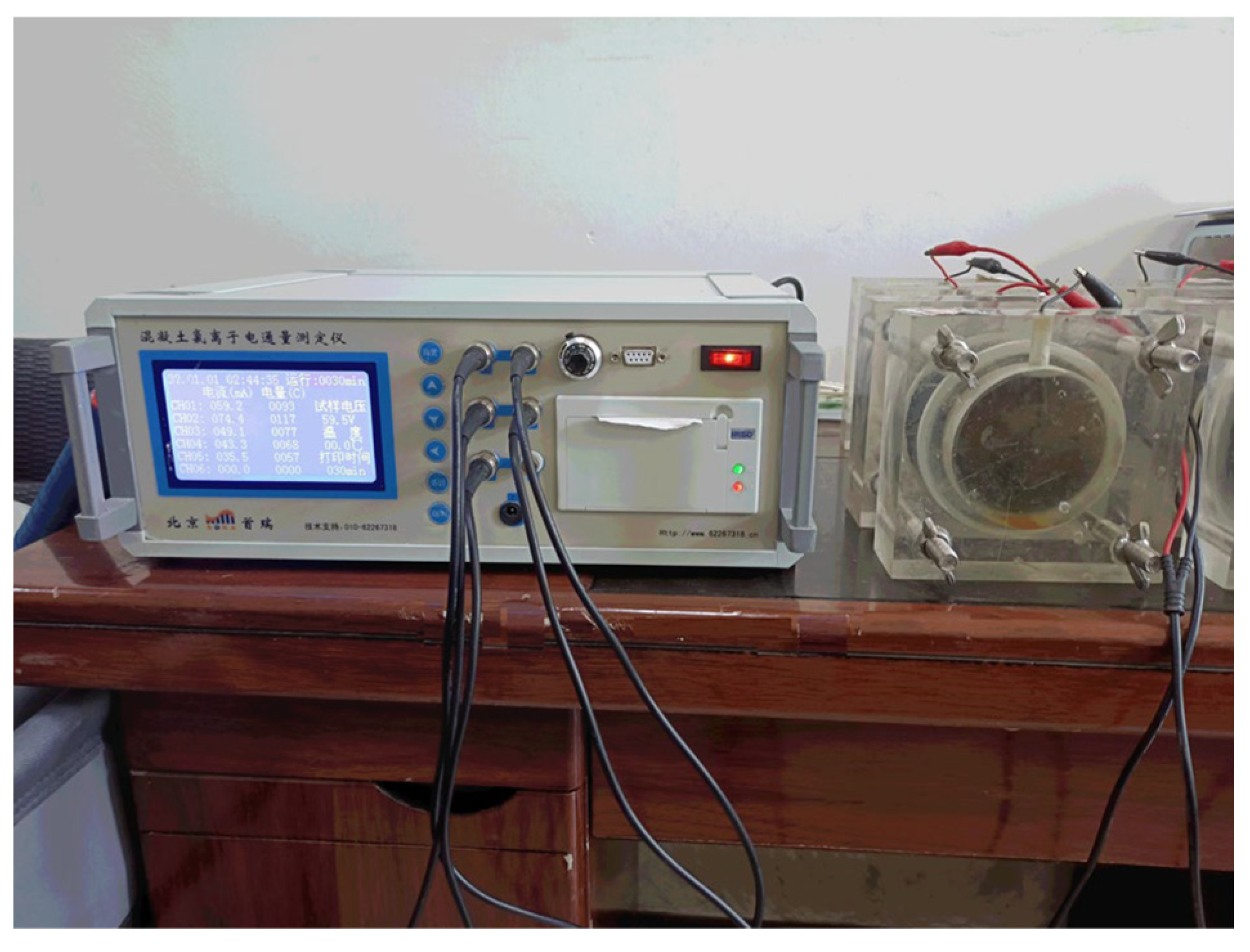 According to the JTG 3420-2020, the chloride penetration resistance of concrete was evaluated using the electric flux method, as shown in Figure 6. Disk-shaped specimens with a diameter of 100 ± 1 mm and a height of 50 ± 2 mm were prepared and cured for 28 days. After curing, the sides of each specimen were sealed with two layers of epoxy resin. A 3% sodium chloride (NaCl) solution was used to test the chloride ion resistance. The total electric charge passed through the specimen within 6 h was used as the evaluation index. The current passing through the specimen was measured every 30 min using a concrete chloride ion electric flux tester manufactured by Beijing Shourui Co., Ltd., China. The accumulated current over 6 h was recorded as the electric flux. Three specimens were prepared for each group, and the measured value was taken as the arithmetic mean of the three specimens. The calculation of electric flux is shown in Equation (4):