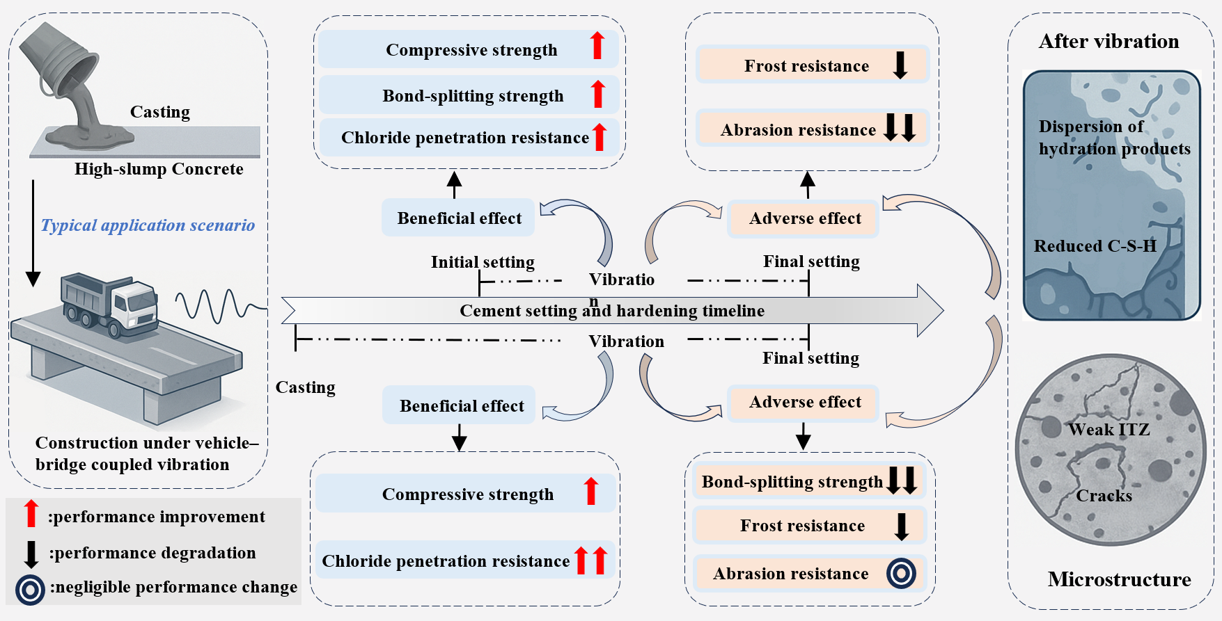 Based on this background, this study prepared high-slump concrete and simulated vehicle–bridge coupled vibration to investigate its effects on mechanical and durability properties. Two vibration loading modes were designed according to the initial and final setting times: one applied vibration throughout the casting to final setting process, and the other applied vibration only during the initial to final setting stage. The effects of vibration were evaluated in terms of compressive strength, bond-splitting strength, freeze–thaw resistance, chloride ion penetration resistance, and abrasion resistance. Scanning electron microscopy (SEM) was also used to analyze microstructural changes and reveal the mechanisms behind performance evolution.