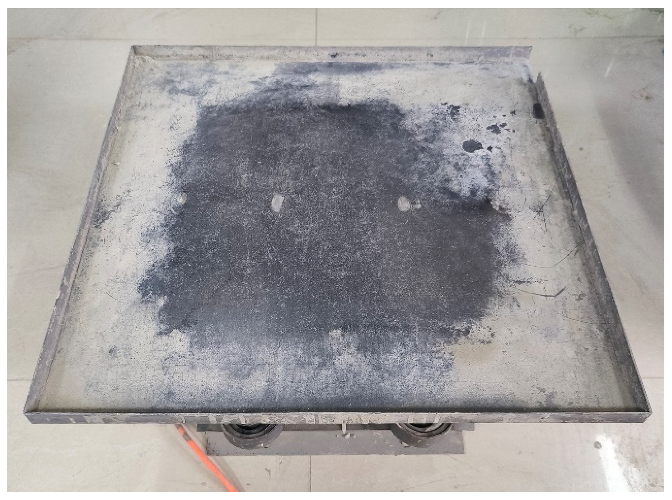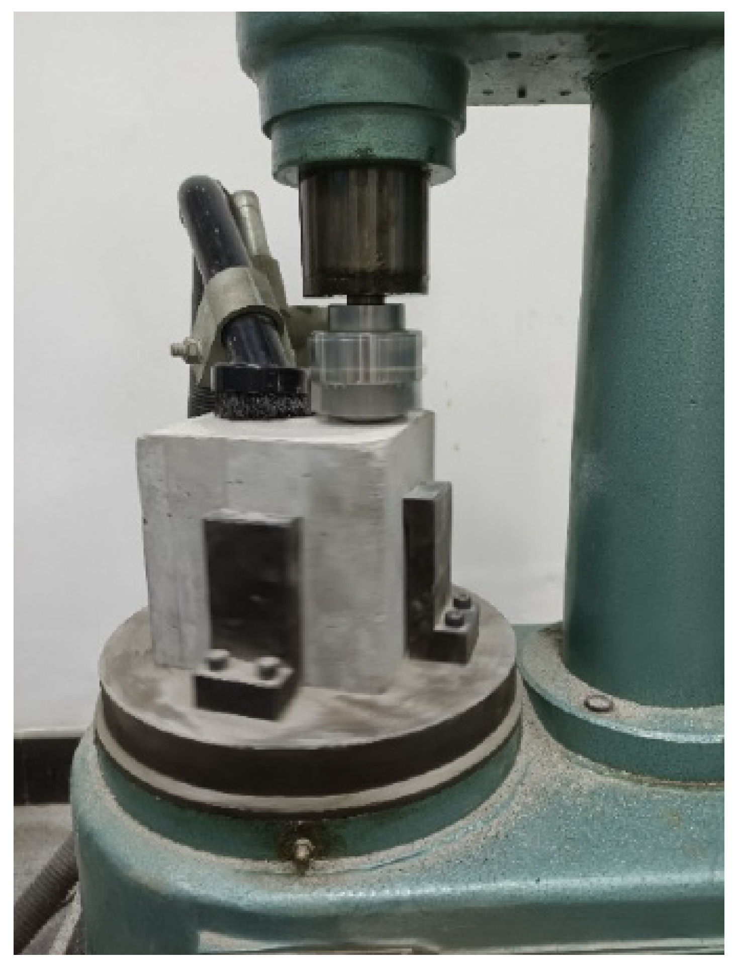 Vibration significantly affects the compactness of the formed surface of concrete, which in turn influences its abrasion resistance. To study the impact of vibration on the abrasion resistance of concrete, the surface of 28-day-old concrete was used as the abrasion surface of the specimen []. According to the JTG 3420-2020 standard, concrete specimens with dimensions of 150 mm × 150 mm × 150 mm were prepared and cured for 28 days. The abrasion resistance of the concrete was then tested using a concrete abrasion testing machine manufactured by Wuxi Jianyi Instrument & Machinery Co., Ltd., China, as shown in Figure 7. Under a load of 200 N, the specimen was ground for 30 revolutions, and the mass at this stage was recorded as m1. Then, the specimen was further ground for 60 additional revolutions under the same load, and the mass was recorded as m2. Three specimens were prepared for each group, and the measured value was taken as the arithmetic mean of the three specimens. The mass loss per unit area of concrete due to abrasion is calculated using Equation (5):