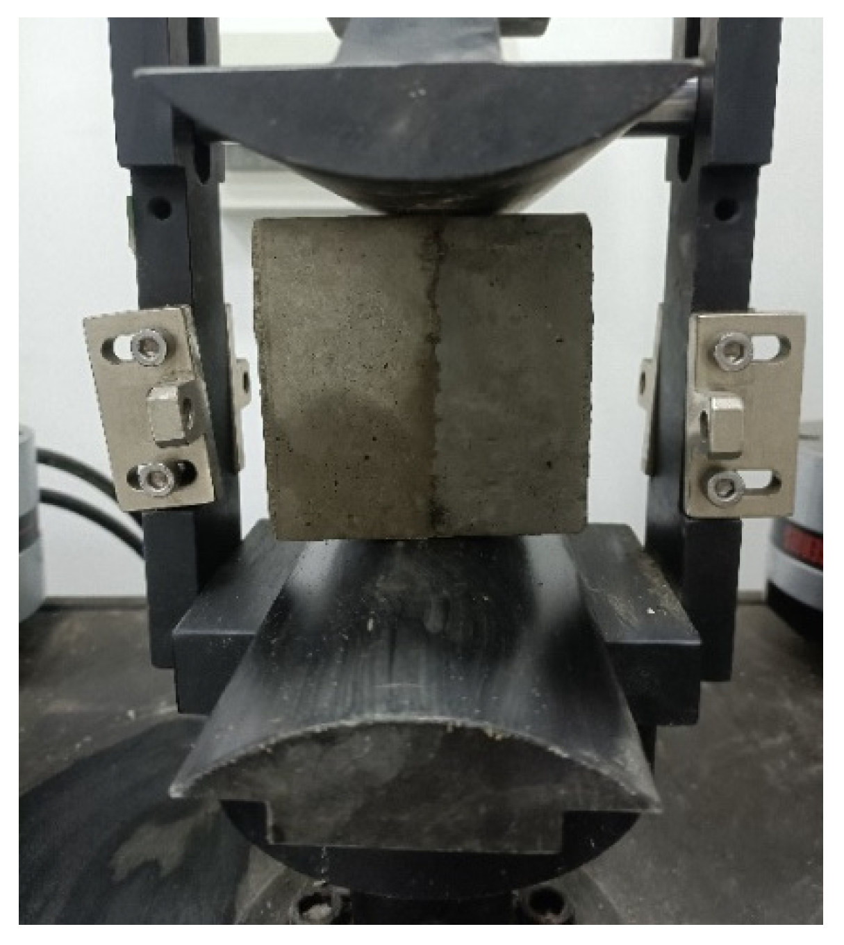 According to the JTG 3420-2020, the bond-splitting strength was tested using a universal testing machine with a capacity of 100 kN manufactured by Wuxi Jianyi Instrument & Machinery Co., Ltd., China. Ordinary concrete prisms with dimensions of 100 mm × 100 mm × 100 mm were prepared as old concrete and cured under standard conditions for 28 days. The old concrete specimens were then cut in half using a cutting machine to obtain two 100 mm × 100 mm × 50 mm concrete blocks. The cut surface was used directly as the casting surface, placed facing upward in the mold, and new concrete was poured on top. The specimens were demolded after 24 h, and interfacial bond strength tests were conducted using the universal testing machine at the specified curing ages. The loading rate was maintained at 0.5 MPa/s until specimen failure, and the ultimate load at failure was recorded. Three specimens were prepared for each group, and the measured value was taken as the arithmetic mean of the three specimens. The loading points of the splitting fixture were kept in contact with the bonding interface between the old and new concrete [,], as shown in Figure 4. Tests were conducted at concrete ages of 1, 7, 14, and 28 days, respectively. The calculation of the disturbance coefficient for bond-splitting strength (Kbs) is similar to that for compressive strength.