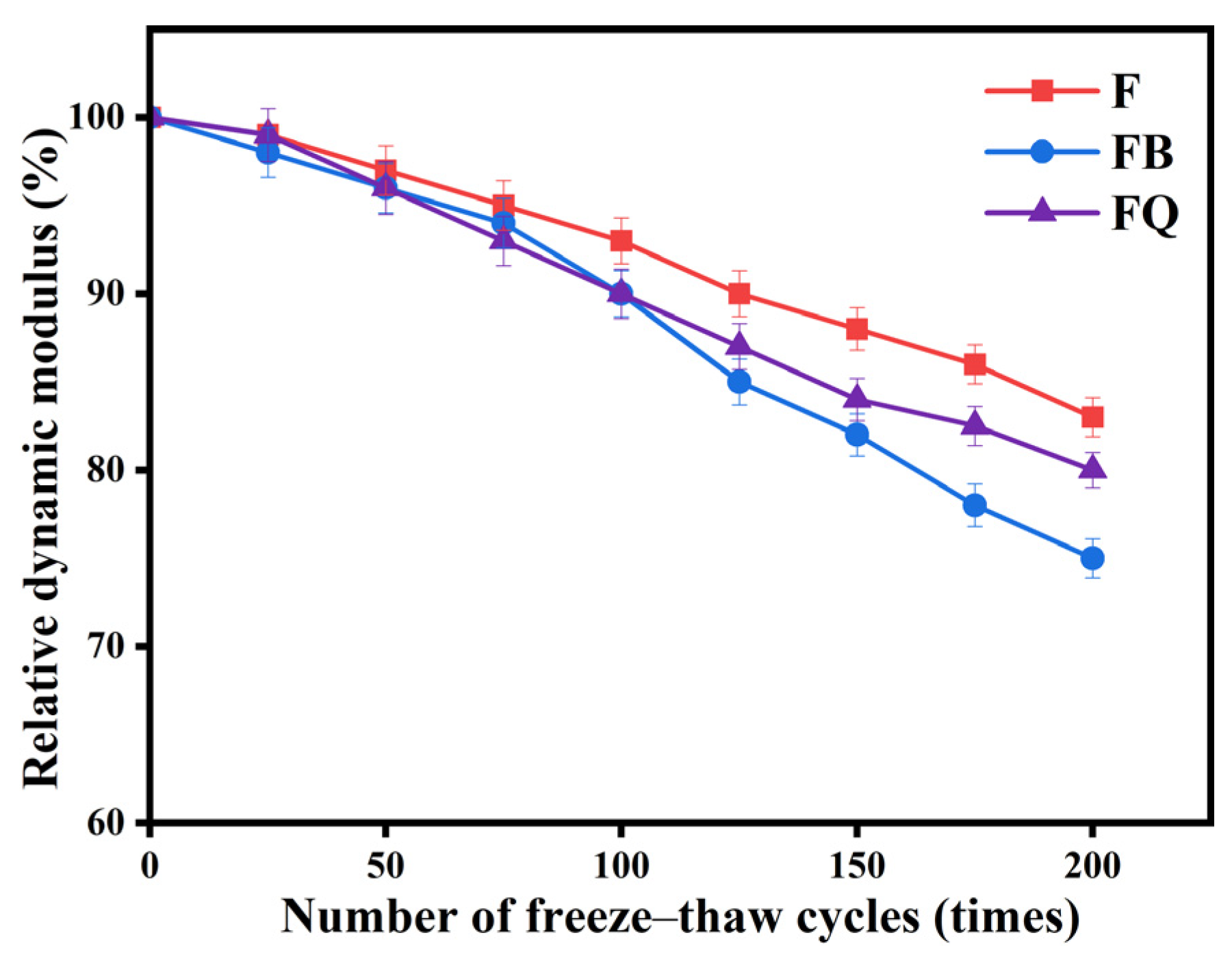 Figure 18 shows the relative dynamic elastic modulus of vibrated concrete after freeze–thaw cycles. With increasing freeze–thaw cycles, the dynamic elastic modulus of normal concrete changes slowly within the first 200 cycles. Different curing environments also cause significant differences in relative dynamic elastic modulus. Group FB shows the fastest decline in relative dynamic elastic modulus. This is because vibration from initial to final setting increases microcracks and pores inside the semi-solid concrete. During freeze–thaw, moisture gathers in these weak points, causing stress concentration and faster crack growth. Additionally, vibration affects the distribution of hydration products. Key bonding hydration products, such as C-S-H gel, lose continuity and density, making it difficult to resist freezing expansion stress. This shows that vibration during the initial to final setting stage has the greatest negative impact on concrete freeze–thaw resistance. Therefore, in cold regions or winter construction, bridge coupled vibration during this stage can cause more significant damage to concrete.