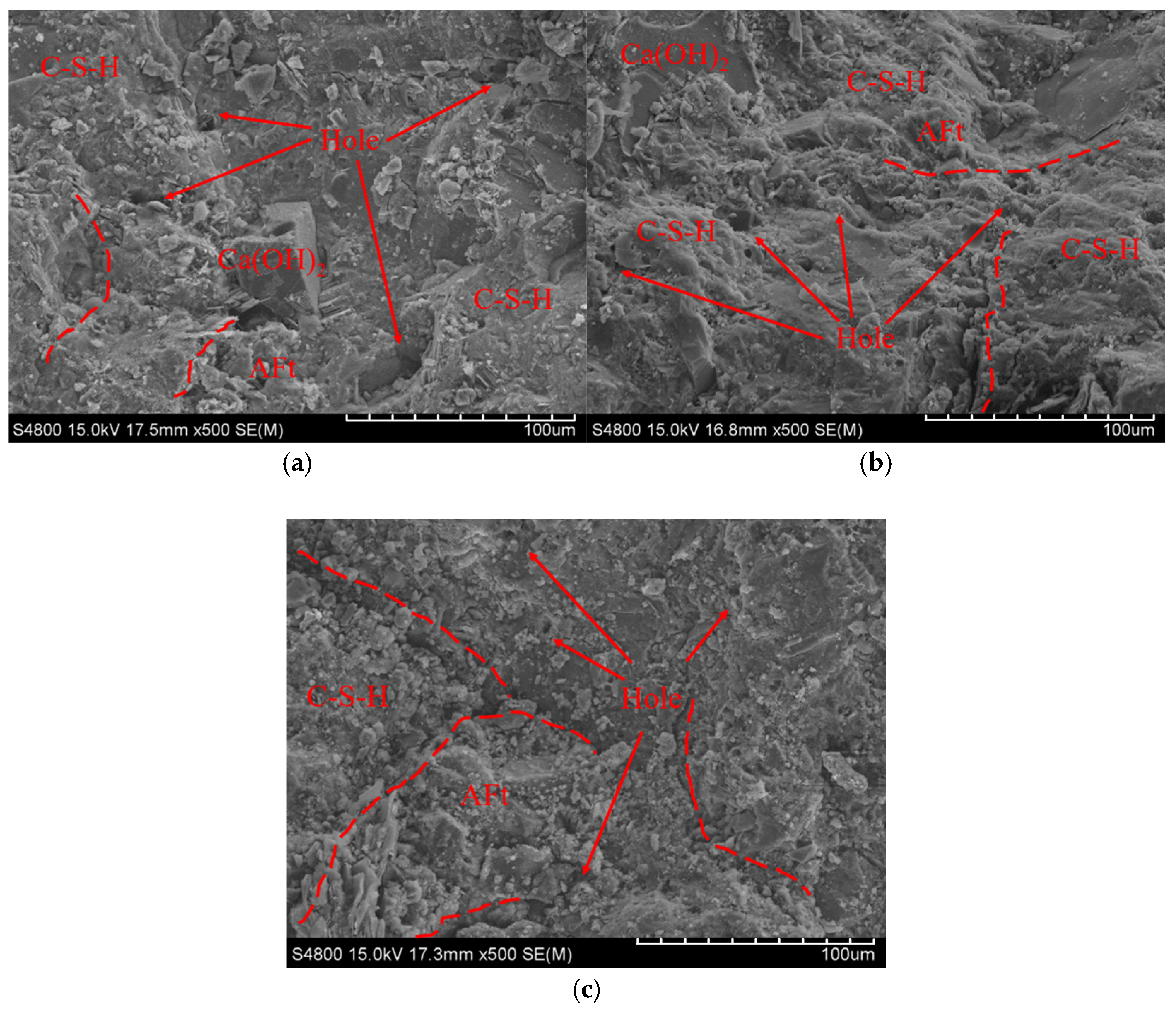 Due to the damage caused by freeze–thaw cycles to the internal structure of concrete, microscopic analysis was conducted on concrete specimens after the freeze–thaw test. Specifically, a cube measuring 5 mm × 5 mm × 2 mm was selected from the center of the fractured freeze–thaw specimen for further analysis. The cube was soaked in absolute ethanol until cement hydration was fully stopped. After that, the sample was dried and coated with gold. Then, a scanning electron microscope (S-4800) manufactured by Hitachi, Japan, was used to scan the surface of the specimen to observe pore structures and the morphology of hydration products, as shown in Figure 8. In addition, since the bonding performance between repair concrete and old concrete significantly affects repair quality, the interface between the new and old concrete was also analyzed using a scanning electron microscope to explore the bonding mechanism.