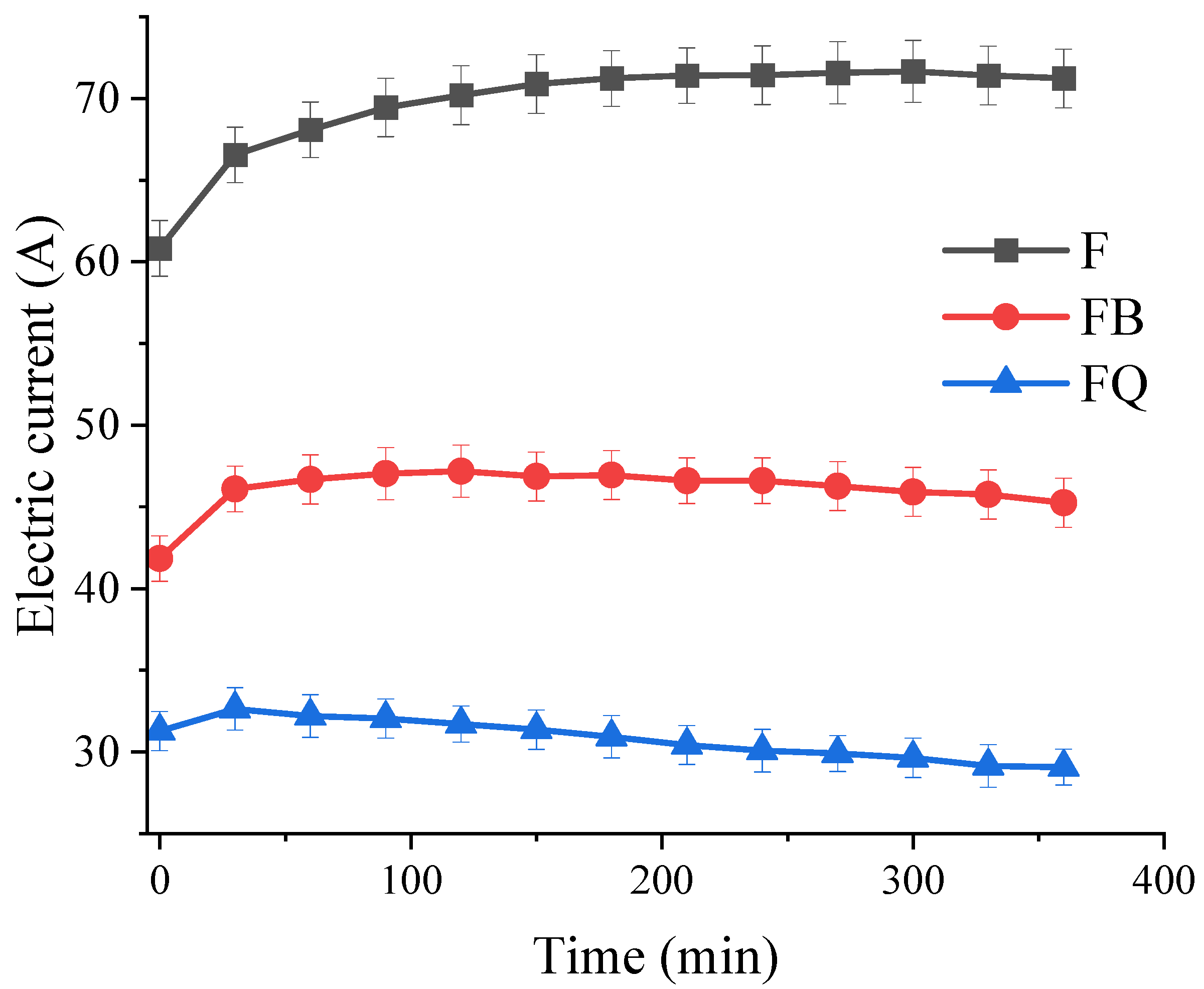 The most remarkable result was observed in group FQ. Its current values remained the lowest with minimal fluctuations throughout the test, with a total electric flux of only 695 C, corresponding to a very low permeability grade. This indicates that continuous vibration applied while the matrix was still in a fluid state significantly improved overall compactness and interfacial bonding, thereby reducing the probability of forming chloride transport channels and achieving the best blocking effect.