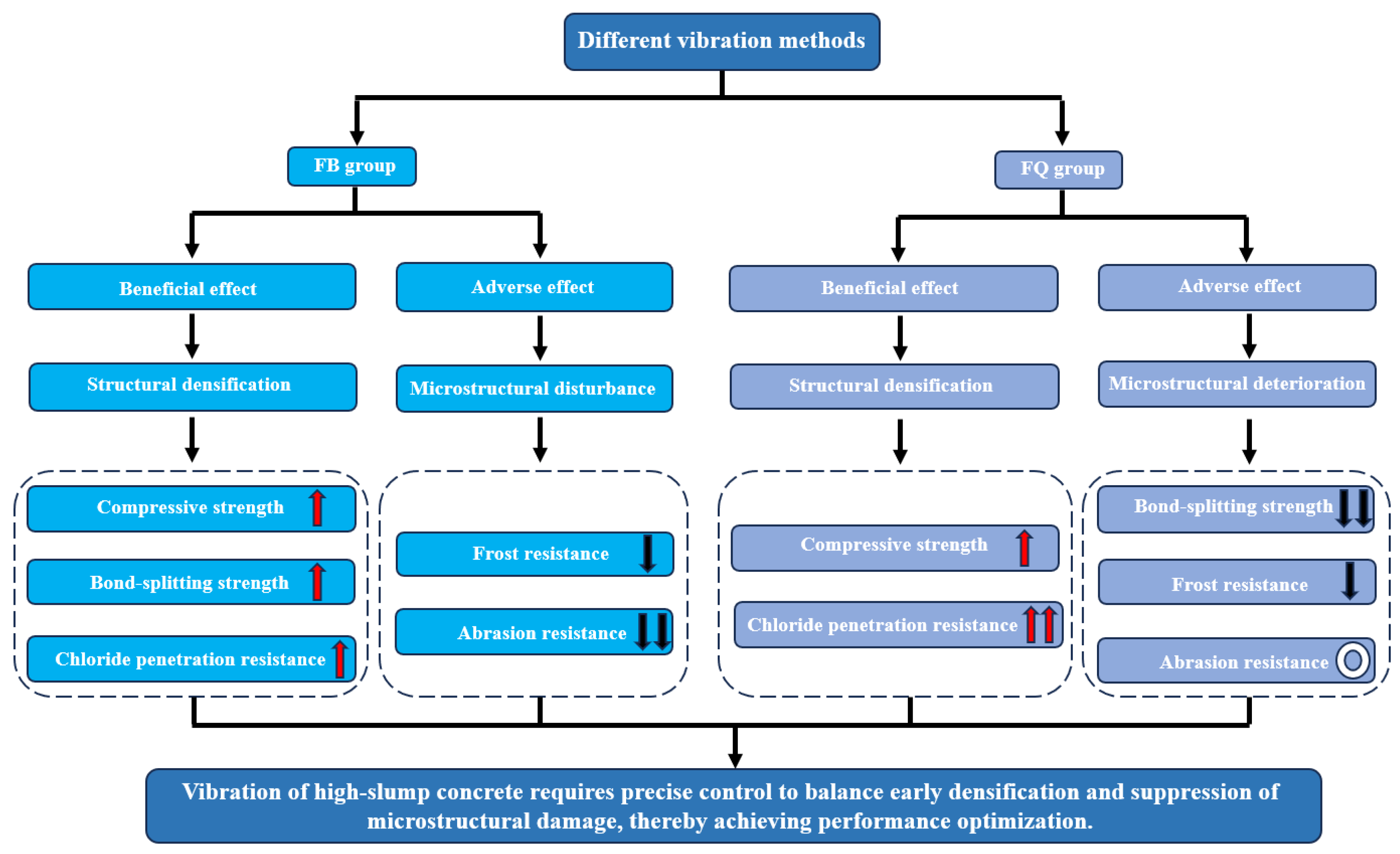 Under different vibration methods, concrete shows complex and multi-dimensional performance changes. This is mainly due to vibration disturbing and reshaping its microstructure. Vibration has a dual effect: on one hand, proper vibration helps remove pores and improve density, which enhances early compressive strength and chloride penetration resistance; On the other hand, excessive or improper vibration can cause paste segregation and uneven distribution of hydration products, leading to microcracks in the interface zone, weaken bonding, and negatively affect bond-splitting strength, frost resistance, and abrasion resistance. The schematic diagram of the effects of different vibration methods on the performance of high-slump concrete is shown in Figure 21.