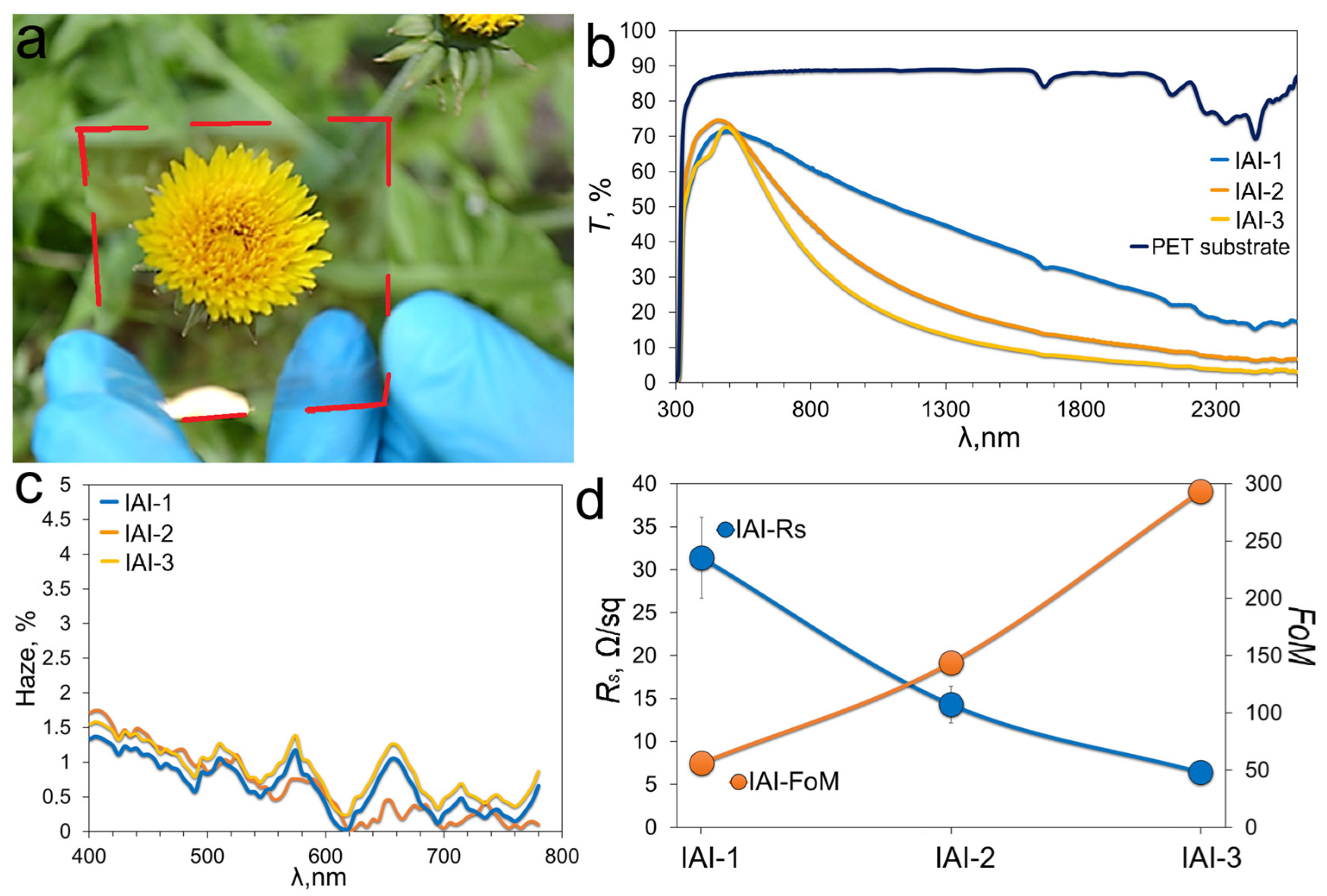 | OMO Type | Rs, Ω/sq | TIAI+PET (500 nm), % | TIAI (500 nm), % | Haze, % | FoM |