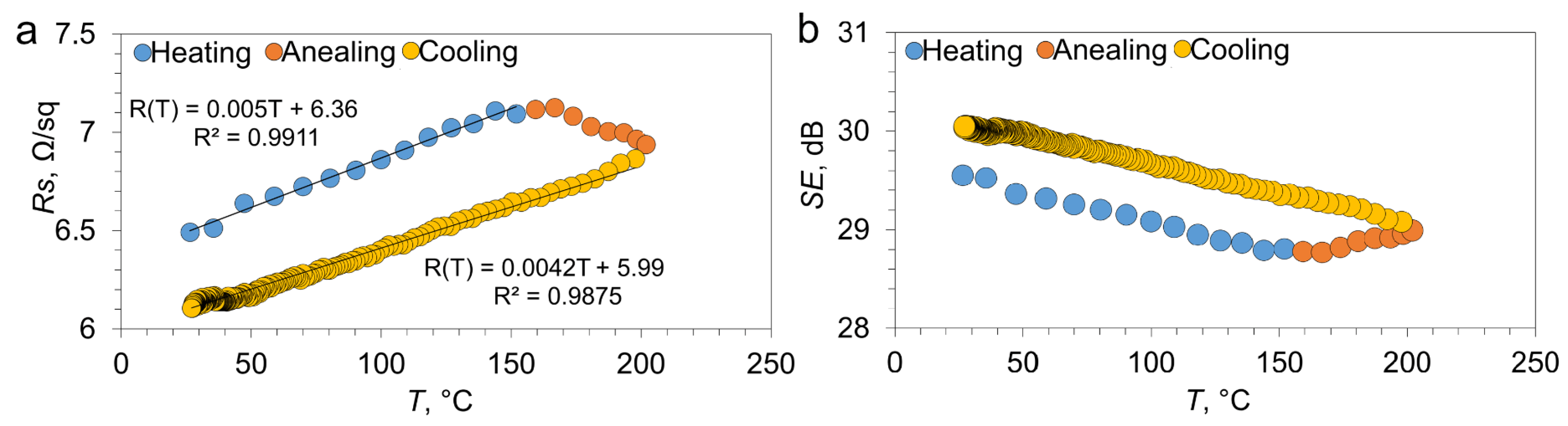 - Voronin, A.S.; Fadeev, Y.V.; Govorun, I.V.; Voloshin, A.S.; Tambasov, I.A.; Simunin, M.M.; Khartov, S.V. A transparent radio frequency shielding coating obtained using a self-organized template. Tech. Phys. Lett. 2021, 47, 259–262. [Google Scholar] [CrossRef]