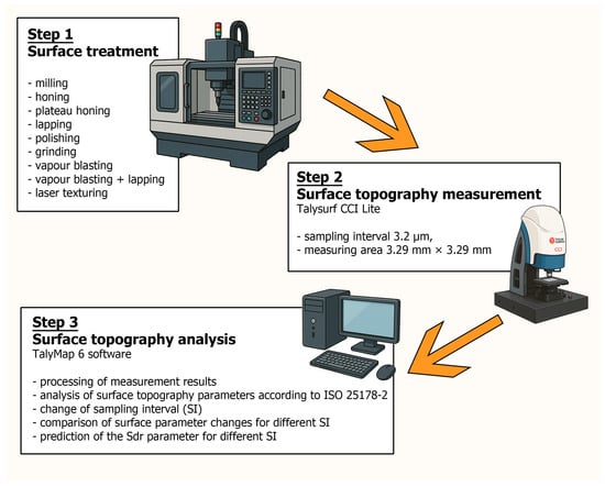 These parameters were calculated for sampling intervals of 3.2, 10, 20, 50, and 100 µm. The sampling intervals of 50 and 100 µm seem to be too large for practical application and considering the used evaluation area. They were analysed to show the tendency for changes in the hybrid parameters. Sampling interval increases were made using TalyMap software. The changes in the parameters of the areal surface texture were compared for various SIs. For these sampling intervals, the application of Formula (3) was tested. Additionally, for different sampling intervals, the values of the linear correlation coefficient between the Sdq and Sdr parameters were calculated.