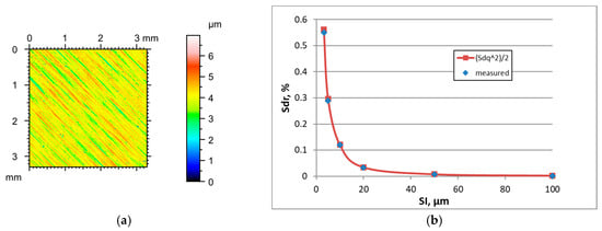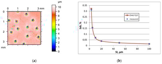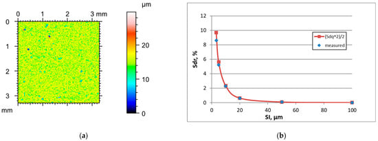 Similarly to other analysed surfaces, the increase in sampling intervals caused decreases in the hybrid parameters of laser-textured surfaces. Skewness Ssk changed marginally with the sampling interval change. The decrease in the Sq parameter with an increase in the SI was smaller than for random surfaces, similar to deterministic textures after milling. The texture aspect ratio Str decreased when the sampling interval decreased. The character of changes in the correlation length Sal with SI changes depended on the kind of surface. When the initial value of the Sal parameter was low (up to 0.05 mm), the increase in the sampling interval caused an increase in Sal. But for an initial Sal value close to 0.2 mm, an increase in the SI led to a decrease in Sal. Figure 9 presents the height map for the smallest sampling interval and the effect of the sampling interval on the Sdr parameter of the laser-textured surface H, characterised by the initial parameter of a Sq parameter of 1.23 µm. Table 9 shows the changes in the hybrid parameters of this surface caused by an increase in the SI. The application of Formula (3) led to overestimation of the Sdr parameter. The highest error, 3.2%, was obtained for the smallest SI, and for higher sampling intervals, the relative errors were smaller than 2%.