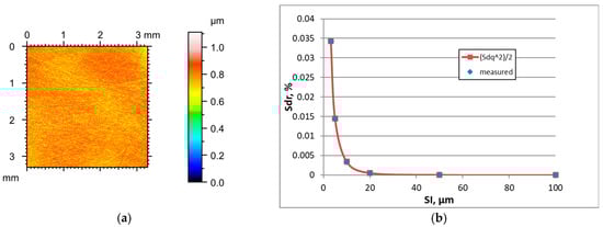 The developed interfacial areal ratio Sdr is related to the surface’s ability to create adhesive joints [,,]. When the Sdr parameter is larger, this ability is also higher. However, it can also be proportional to the Sdq parameter, because Sdq and Sdr are strongly interrelated []. The analysis of the Sdr parameter is important for coating, wettability, and electrical conductivity studies. Croll [] believes that the Sdr parameter is connected with corrosion protection and coating adhesion.