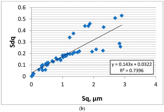 The hybrid parameters depend on the amplitude and spatial properties of the surfaces. They are higher when the main wavelengths are smaller. The hybrid parameters of the laser-textured surfaces were smaller than those of other two-process surfaces because the correlation lengths of the textured surfaces were higher. The two-process surfaces after plateau honing and vapour blasting followed by lapping had similar rms. slope Sdq values because of similar Sal and Sq parameters, although the first group of surfaces was isotropic and the last anisotropic cross-hatched. However, it is difficult to obtain the effect of spatial parameters on the hybrid parameters for surfaces of various texture aspect ratio Str values. The two spatial parameters Sal and Str do not contain detailed information about surface character, such as whether the anisotropic surfaces are one-directional or cross-hatched. It seems that the effects of roughness amplitude on hybrid parameters are larger than the impact of spatial properties because of the high range of surface amplitudes of the analysed surfaces, characterised by the Sq parameter. Figure 10a shows the dependence of the Sq parameter on the initial rms. slope Sdq obtained for the smallest sampling interval for all analysed surfaces (64 data points). However, the correlation between Sq and Sdq is not strong. It is the consequence of the large values of the Sal parameter of deterministic surfaces after milling and most of the random-deterministic surfaces after laser texturing. The other random surfaces are characterised by smaller values of the correlation length Sal. Figure 10b shows this dependence after excluding deterministic and strongly random-deterministic textures to highlight the correlation that appears only for truly random surfaces. Results on deterministic milled surfaces (8 samples) and random-deterministic laser-textured surfaces with large contributions from deterministic components (large values of the pit–area ratio and consequently of the Sal parameters—6 samples) were excluded. The number of data points presented in Figure 10b is 50. The coefficient of determination R2 between Sq and the Sdq parameters in Figure 10b is 0.74; therefore, the coefficient of linear correlation R is strong, 0.86.