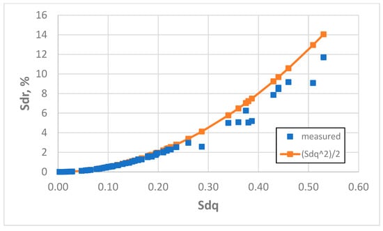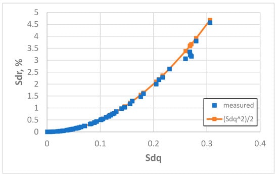 An additional increase in the sampling interval to 20 µm caused an improvement in the estimation of the Sdr parameter using Formula (3). Only in two cases (milled surfaces) were the errors higher than 5% but smaller than 8.1%. The average error was 1.7% and the highest error was 8%. The coefficient of linear correlation between measured and predicted values of the Sdr parameter was 0.9996, but between the measured values of Sdq and Sdr it was 0.949. Figure 14 presents the dependence between the Sdq and Sdr parameters for a sampling interval of 20 µm. A decrease in the coefficient of linear correlation between measured values of the Sdq and Sdr parameters from a sampling interval of 5 µm proved that this dependence was nonlinear in character. An increase in the coefficient of correlation between measured and estimated values of the Sdr parameter confirms Formula (3) better matches the real dependence.