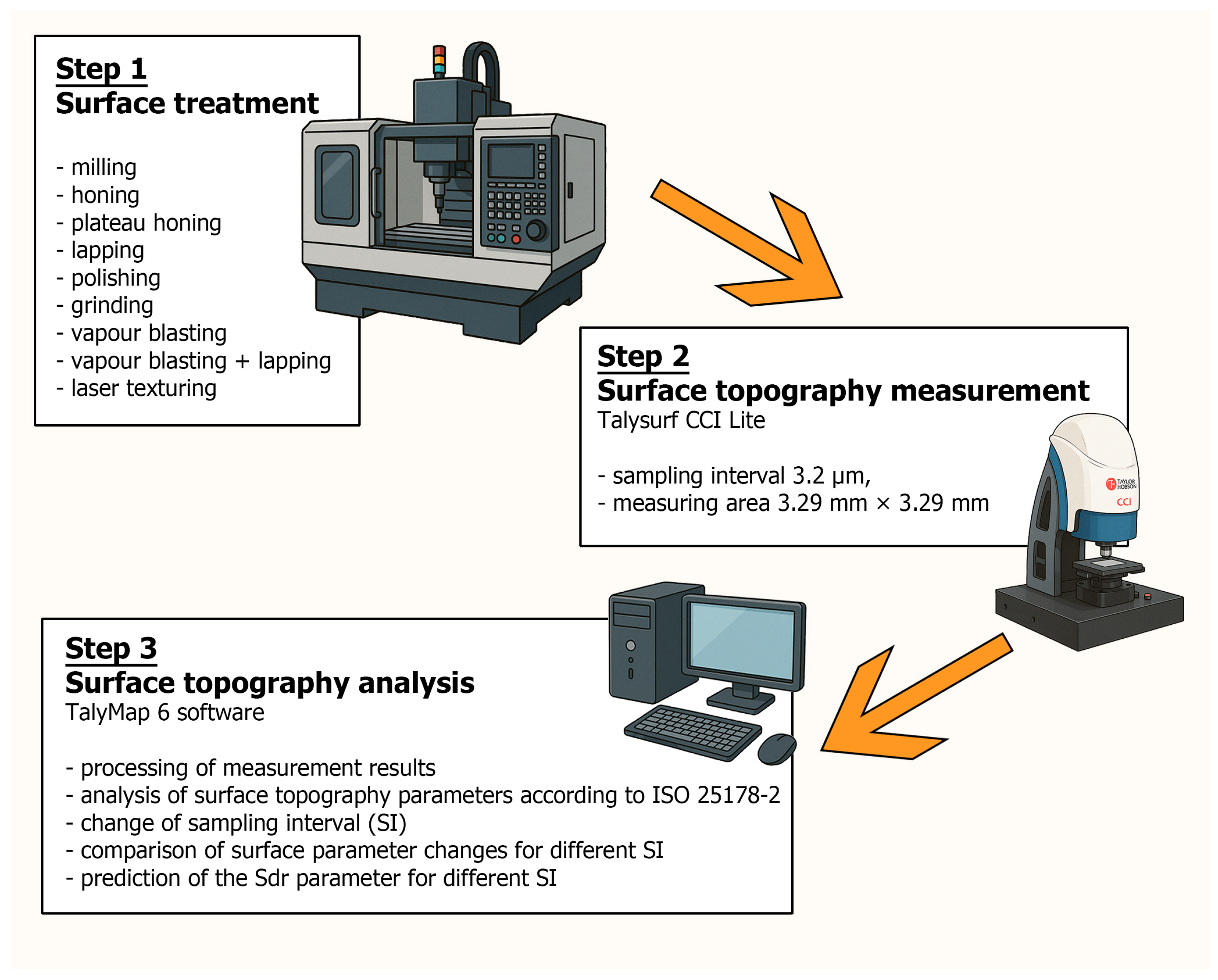 A total of 64 surface topographies were measured using a Talysurf CCI Lite (Taylor Hobson Ltd., Leicester, UK) white light interferometer with a vertical resolution of 0.01 nm and a vertical range of 2.2 mm. Talysurf CCI Lite uses an external white light source, specifically, a 150 W quartz lamp. Before measurements were taken, the samples were cleaned in acetone. Three or four repetitions or measurements per sample were taken and representative textures were analysed. The same measurement condition was applied to all surfaces. Measurements were made using an objective lens with a magnification of 5× and a numerical aperture of 0.13. The sampling interval was 3.2 µm, the measuring area, containing 1024 × 1024 data points, was 3.29 mm × 3.29 mm. For curved surfaces, form was removed by the second-degree polynomial, and flat surfaces were levelled without the application of digital filters. The non-measured points were filled in. Outliers were eliminated by surface truncation [