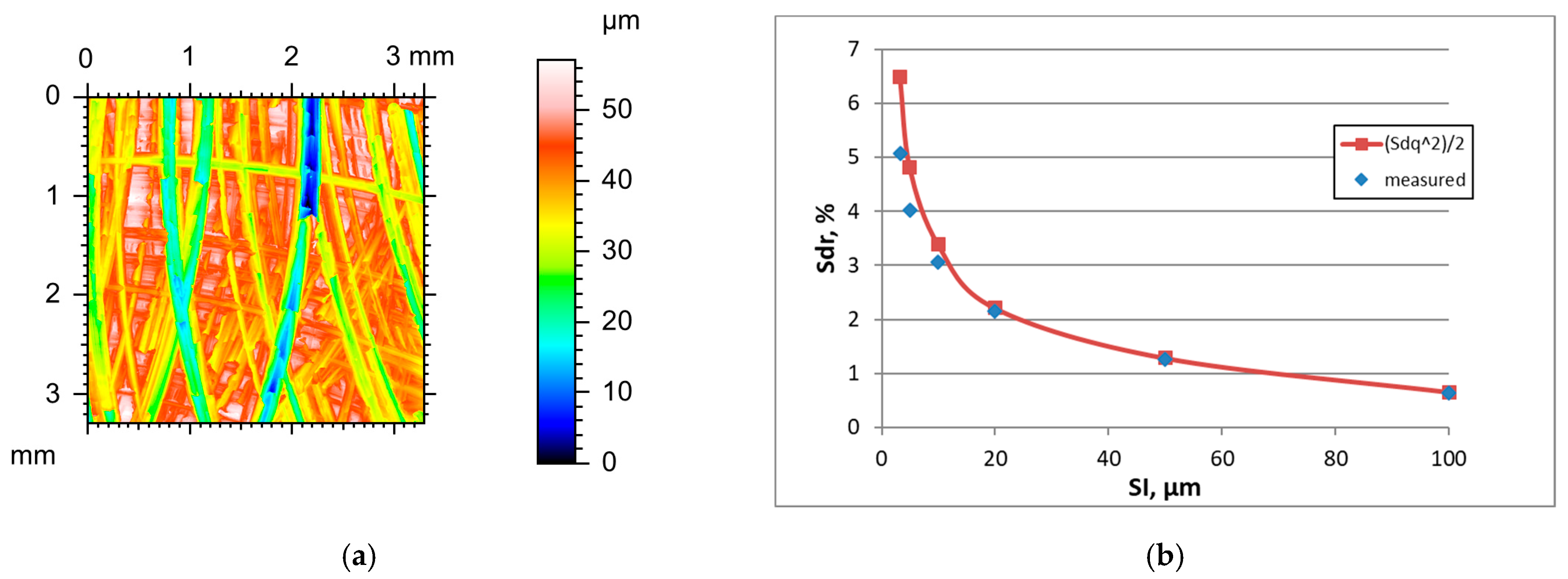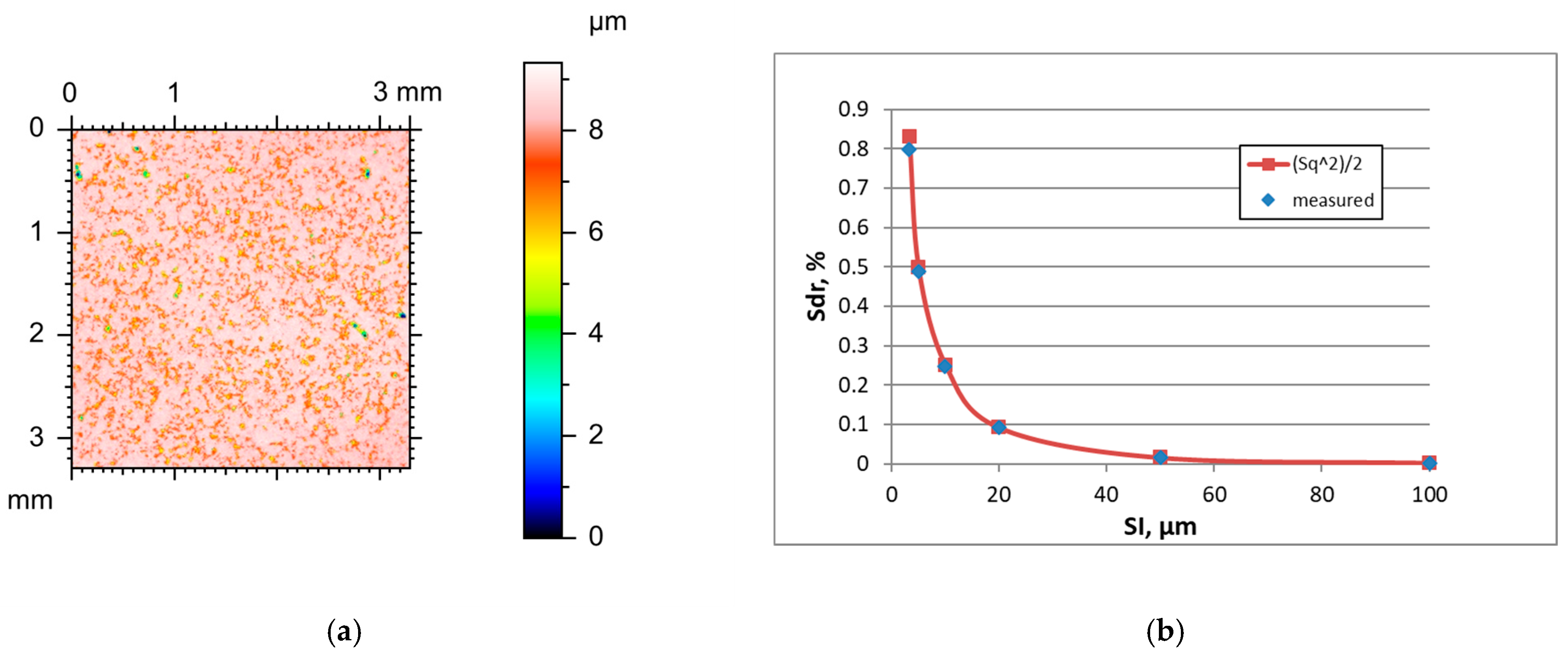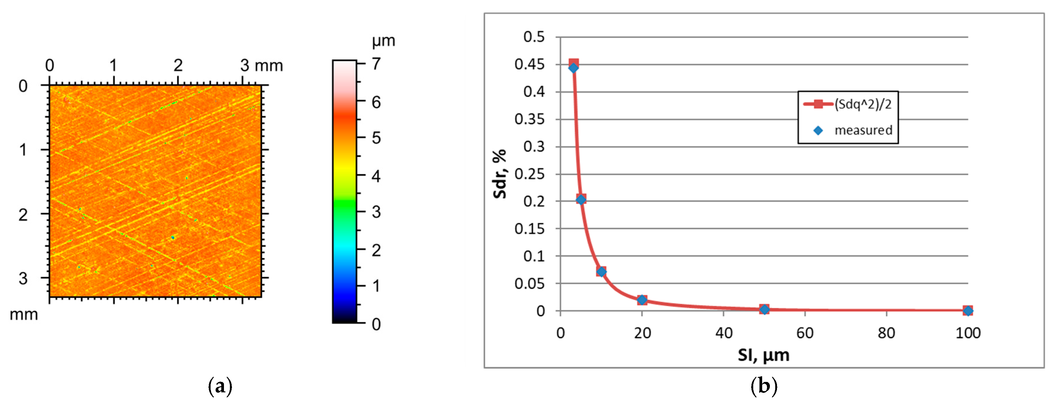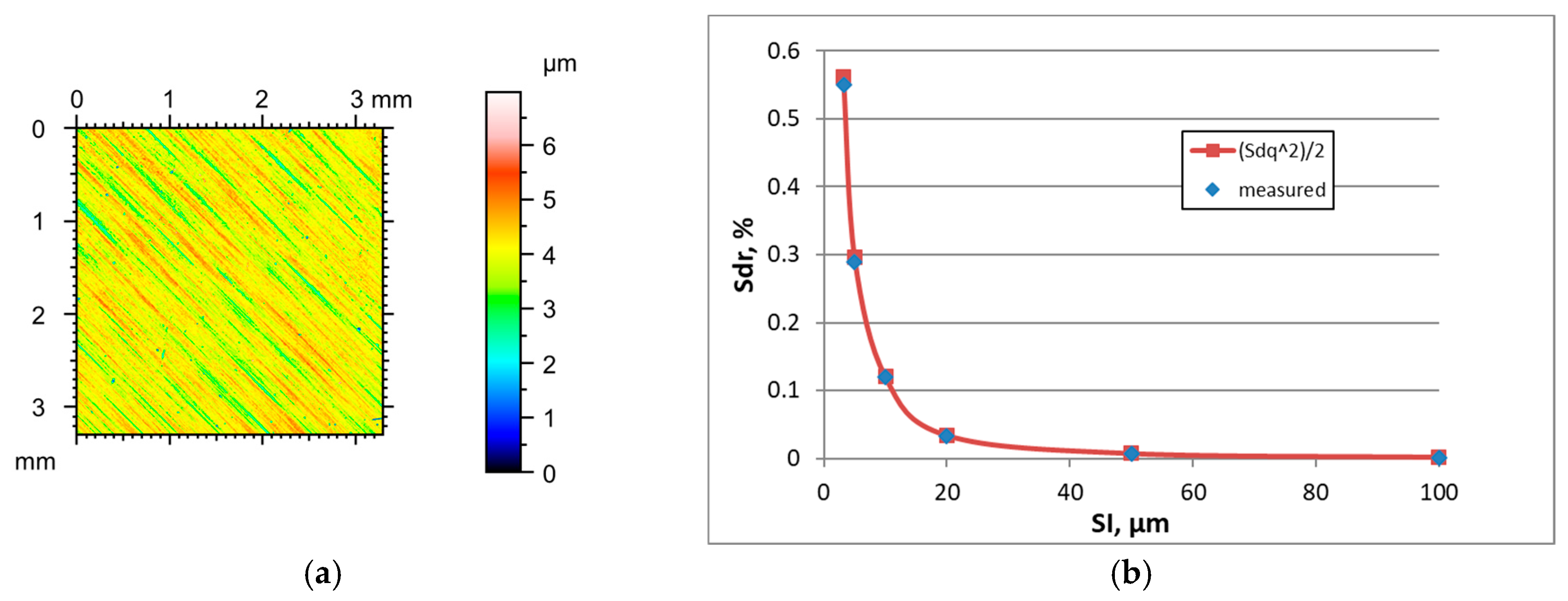 Table 5 shows the changes in the hybrid parameters of this surface caused by an increase in the SI. When the SI was 3.2 µm, the application of Formula (3) led to an overestimation of the Sdr parameter of about 8%. For higher sampling intervals, these overestimations were smaller than 4%.