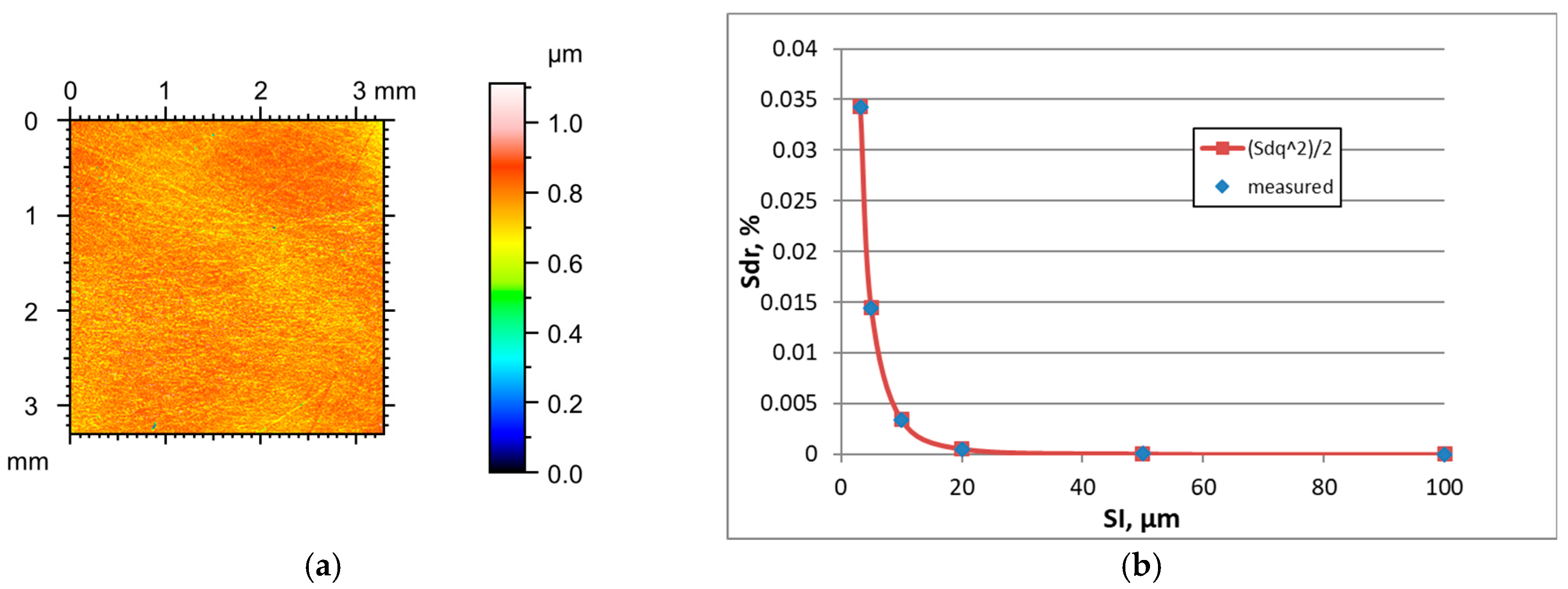 These parameters were calculated for sampling intervals of 3.2, 10, 20, 50, and 100 µm. The sampling intervals of 50 and 100 µm seem to be too large for practical application and considering the used evaluation area. They were analysed to show the tendency for changes in the hybrid parameters. Sampling interval increases were made using TalyMap software. The changes in the parameters of the areal surface texture were compared for various SIs. For these sampling intervals, the application of Formula (3) was tested. Additionally, for different sampling intervals, the values of the linear correlation coefficient between the Sdq and Sdr parameters were calculated.