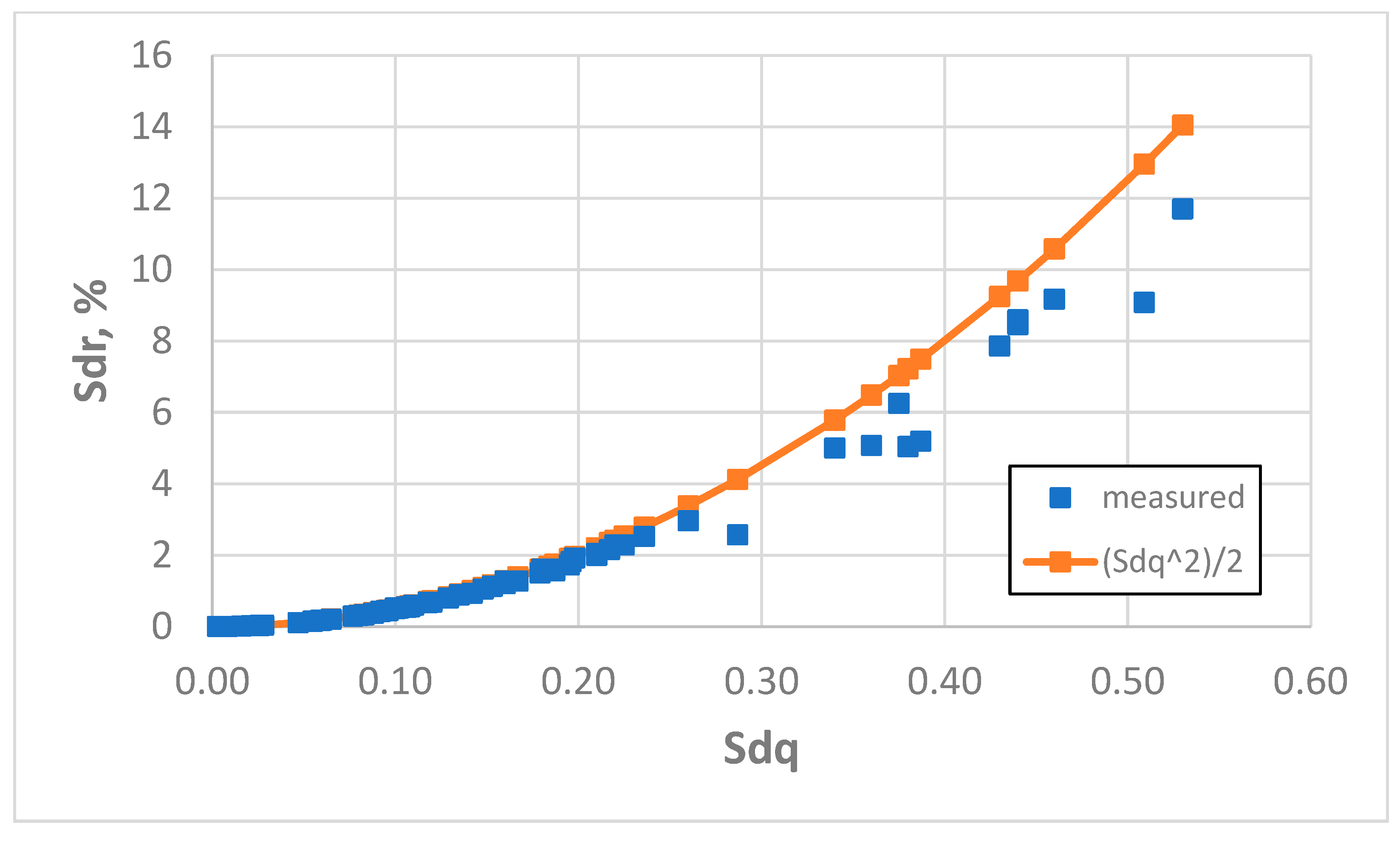 Figure 13 presents the dependence between the Sdq and Sdr parameters for a sampling interval of 10 µm.