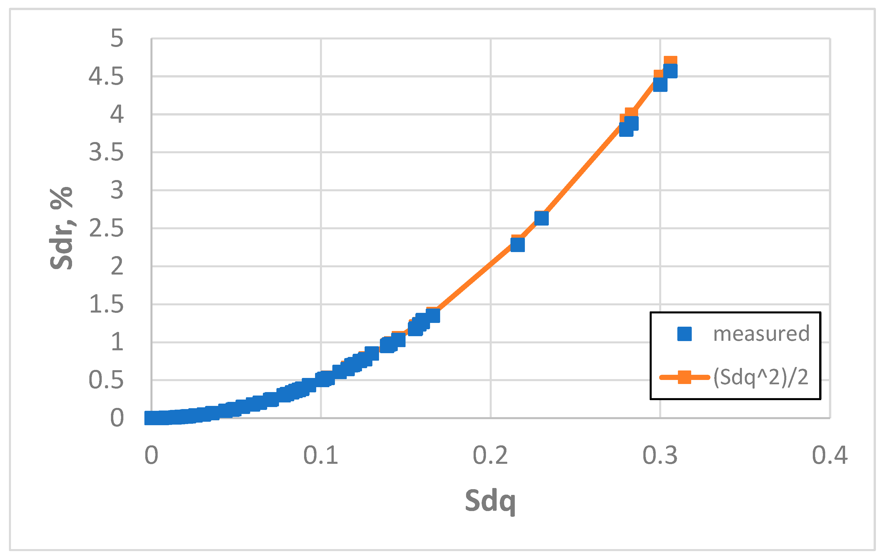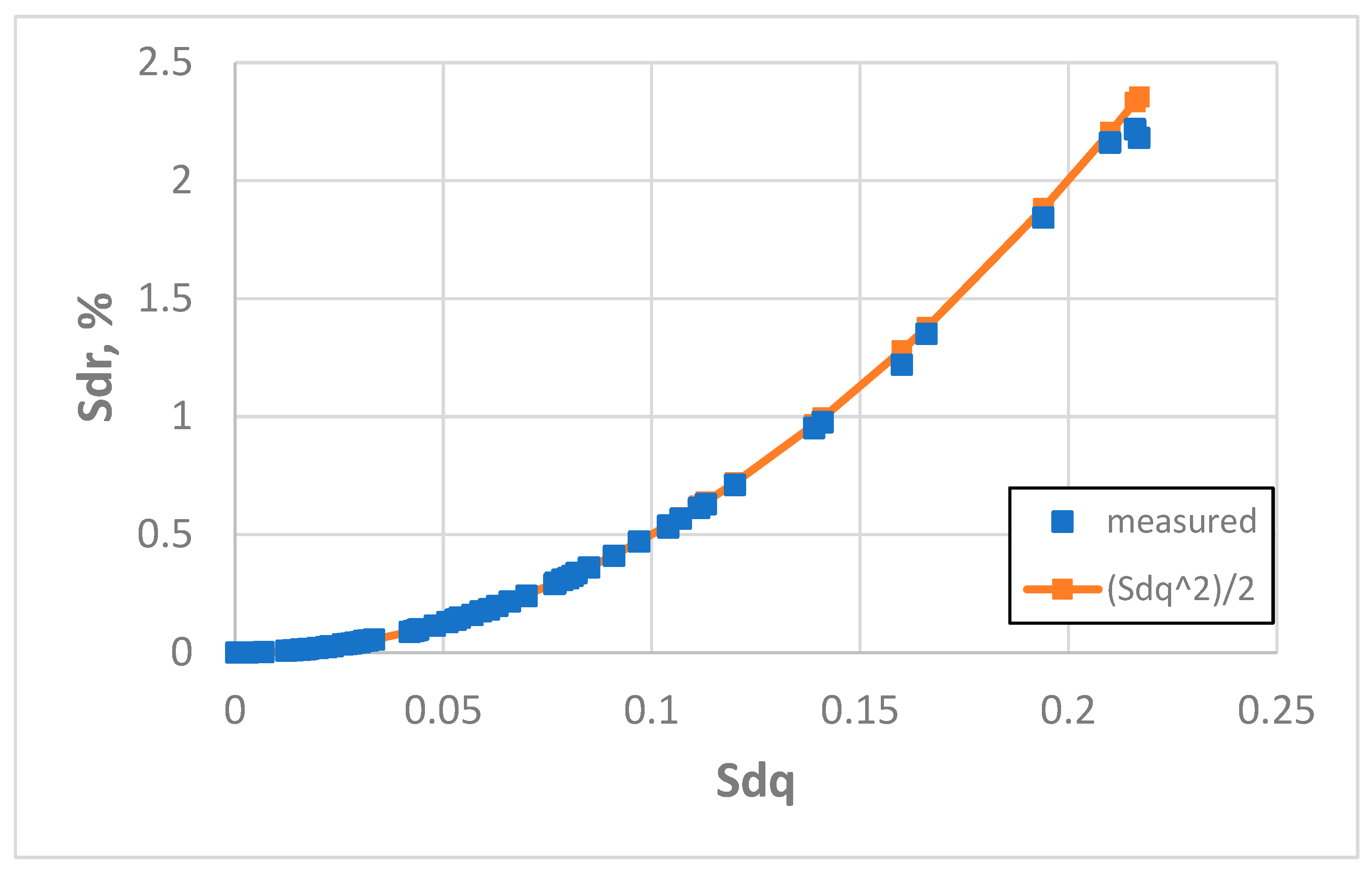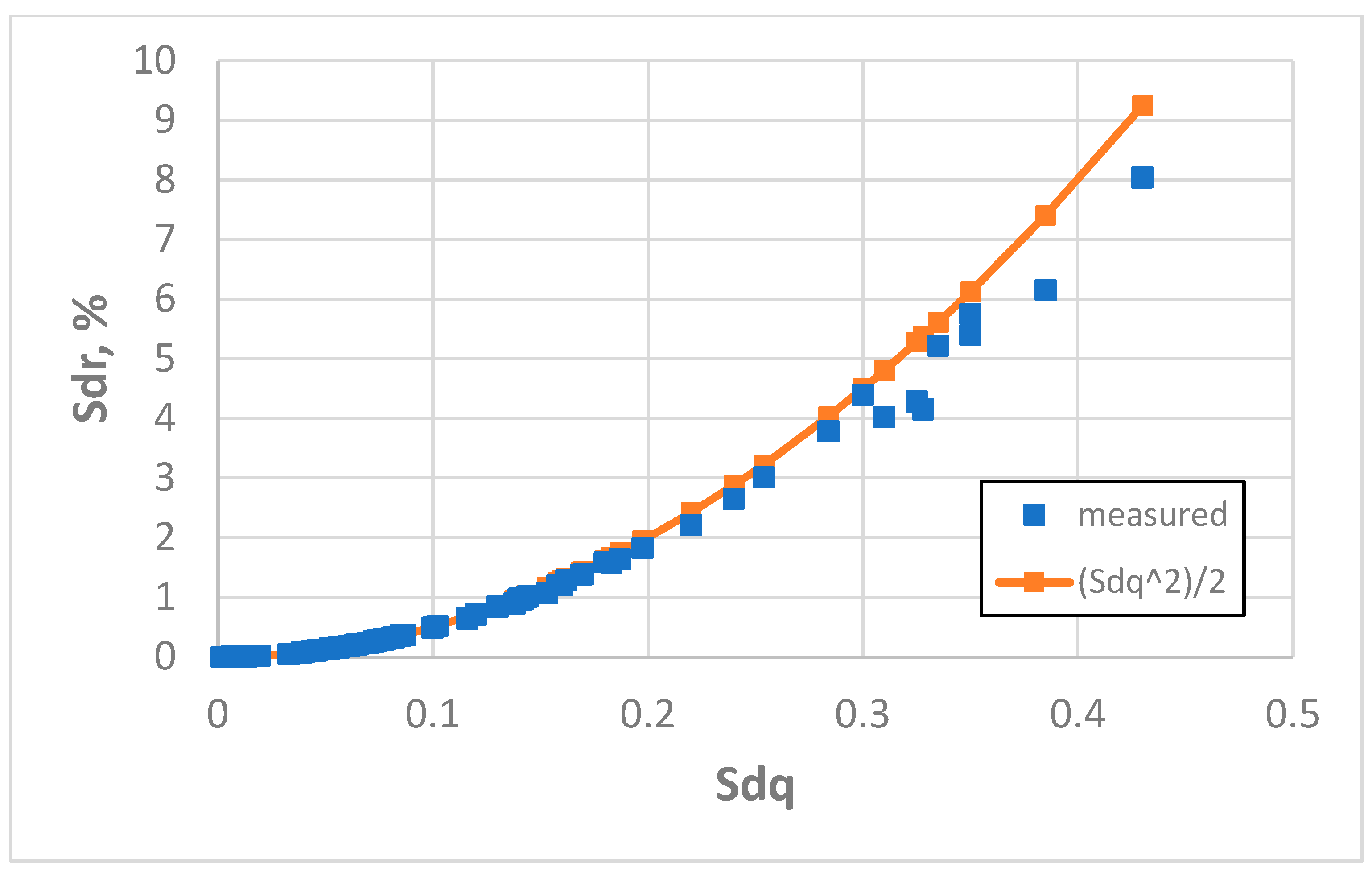 Figure 15 presents the dependence between the Sdq and Sdr parameters for the recommended sampling intervals. The average and maximum errors in the estimation of the Sdr parameter using formula (3) were 1.45 and 3.29%, respectively. The coefficient of linear correlation between measured and predicted values of the Sdr parameter was 0.9999, but between the measured values of the Sdq and Sdr parameters it was 0.938. It attests to the very good estimation of the Sdr parameter using Formula (3) and to the nonlinear dependence between the hybrid parameters Sdq and Sdr.