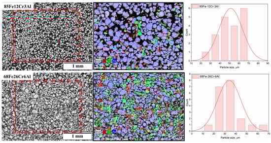 As the starting materials, powders of pure metals—iron (Fe), chromium (Cr), and aluminum (Al)—with a chemical purity of no less than 98% and particle sizes ranging from 15 to 40 µm were used. To obtain powder mixtures with compositions of 85Fe-12Cr-3Al and 68Fe-26Cr-6Al (wt.%), the corresponding amounts of elemental powders were mechanically mixed in an Emax planetary ball mill for 4 h at a rotation speed of 200 rpm. Figure 1 presents the morphology, elemental composition, and particle size distribution of the 85Fe-12Cr-3Al and 68Fe-26Cr-6Al powder mixtures obtained by mechanical mixing of pure metal powders (Fe, Cr, Al) in a ball mill. The SEM images (BSE mode) show a wide range of particle shapes and sizes in both compositions. The particles predominantly exhibit irregular shapes, which is typical for powders subjected to intensive mechanical treatment. The EDS elemental maps reveal the presence of individual particles enriched in iron (blue), chromium (green), and aluminum (red), which is attributed to the absence of preliminary alloying. This pattern reflects physical mixing rather than metallurgical bonding of the components and indicates that the mixtures retain a heterogeneous structure at this stage. However, the particles are uniformly distributed across the field of view without signs of agglomeration or macroscopic segregation.