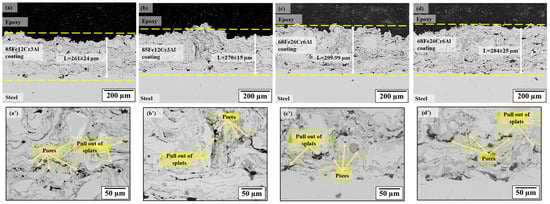 Cross-sections of Fe-Cr-Al coatings obtained under various APS regimes: (a,a’) regime A1, (b,b’) regime A2, (c,c’) regime B1, (d,d’) regime B2.