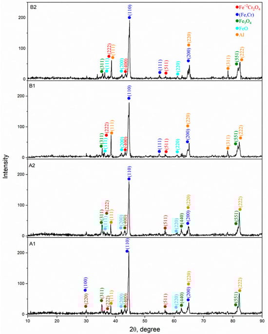 X-ray phase analysis of coatings obtained under various regimes of air plasma spraying (Figure 3) showed the presence of several main phases in their composition: (Fe, Cr) a solid solution based on BCC-iron (ICDD 00-041-1466), Fe3O4 (ICDD 01-074-0748), FeO (ICDD 01-074-1880), Fe2+Cr2O4 (00-034-0140) and Al (01-085-1327) in the metallic state. The formation of such phases is a consequence of the partial oxidation of particles during spraying, as well as the interaction of iron, chromium and aluminum under conditions of rapid heating and cooling. In all coatings, the diffraction patterns are dominated by the peaks of the metallic (Fe,Cr) solid solution, indicating that the metallic matrix remains the primary structural component regardless of the spraying parameters. The oxide phases appear as weak reflections that are characteristic of thin oxide interlayers and interlamellar inclusions formed during APS as a result of partial in-flight oxidation of the particles. Comparison of the diffractograms of the A and B series shows that the phase composition is qualitatively identical in all cases, and the differences are expressed only in the relative intensities of individual reflections, which reflects the influence of plasma-jet parameters on particle melting and their interaction with atmospheric oxygen. The A-series coatings exhibit a combination of intense metallic peaks and weak oxide reflections, corresponding to a moderate degree of oxidation. The B-series coatings also contain oxide phases, although the relative intensities of their peaks vary with the spraying regime, which is associated with the thermal history of the particles at elevated Cr and Al content. Overall, the XRD results demonstrate that, regardless of the APS regime, the coatings are formed via a common mechanism involving a metallic (Fe,Cr) solid solution as the dominant phase and a limited amount of oxide phases, confirming the stability and reproducibility of the Fe-Cr-Al phase composition under varying spraying parameters.