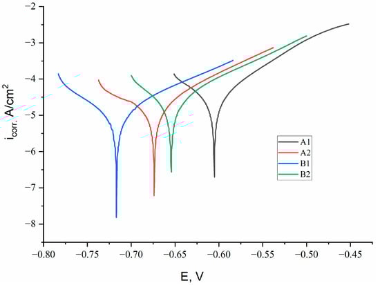 According to the electrochemical parameters summarized in Table 2, the coatings produced under different APS regimes exhibit distinct corrosion behaviors. For sample A1, the anodic (βa = 78.1 V/dec) and cathodic (βc = 116.1 V/dec) Tafel slopes indicate relatively active anodic dissolution and moderately hindered cathodic reactions. The corrosion current density is the highest among all samples (icorr = 4.67 × 10−5 A/cm2), while the corrosion potential (Ecorr = −0.605 V) is shifted toward more negative values, reflecting lower thermodynamic stability. Consequently, the corrosion rate reaches 0.547 mpy, demonstrating the weakest corrosion resistance in this group. For sample A2, an increase in hydrogen flow rate leads to higher Tafel slopes (βa = 93.6 V/dec, βc = 172.0 V/dec), which reflects a slowdown of both anodic and cathodic processes. The corrosion current density decreases nearly twofold (icorr = 2.58 × 10−5 A/cm2), and Ecorr shifts slightly more negative (−0.674 V), which is typical for denser but chemically similar surfaces. The corrosion rate drops to 0.303 mpy, confirming that improved melting and densification of the lamellae enhance the protective properties of the coating. Sample B1 demonstrates the most favorable combination of electrochemical parameters. The anodic slope (βa = 97.7 V/dec) suggests reduced dissolution kinetics, while the cathodic slope (βc = 88.6 V/dec) indicates relatively slow cathodic reactions. This coating exhibits the lowest corrosion current density (icorr = 1.43 × 10−5 A/cm2) and the most positive corrosion potential among all samples (Ecorr = −0.717 V), reflecting high thermodynamic stability. The resulting corrosion rate is minimal (0.168 mpy), indicating that the higher Cr and Al content in the 68Fe-26Cr-6Al composition effectively promotes the formation of a stable passive oxide layer. For sample B2, the anodic and cathodic slopes (βa = 90.2 V/dec and βc = 82.7 V/dec, respectively) indicate moderate inhibition of both anodic and cathodic processes. The corrosion current density is slightly higher than that of B1 (icorr = 2.90 × 10−5 A/cm2), and the corrosion potential shifts to −0.654 V. The corresponding corrosion rate is 0.340 mpy, which is lower than that of both A1 and A2 but higher than B1. This behavior reflects a balance between improved lamellar compaction and localized defects formed at higher hydrogen flow rates. most optimal combination of kinetic and thermodynamic electrochemical parameters.