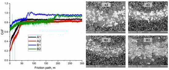 Figure 5 shows the dependences of the coefficient of friction (µ) on the friction path for coatings formed under various APS regimes. For all samples, a typical staged evolution of the curve is observed: in the initial section (up to 40–60 m), the friction coefficient increases due to the running-in of the counterbody and the removal of surface irregularities. After this stage, the value stabilizes with minor fluctuations. For the A1 coating, the friction coefficient stabilizes at 0.820 ± 0.107. It is assumed that the moderate friction stability may be related to the formation of an oxide film resulting from tribo-oxidation products. In regime A2, the average friction coefficient decreases to 0.764 ± 0.134. This is presumably due to a denser coating structure resulting from improved particle melting at a higher hydrogen flow rate. The curve exhibits a smooth increase in µ and a more uniform running-in process, which may indicate enhanced plasticity of the top layer. The B1 coating shows the most stable curve with minimal fluctuations and an average value of 0.933 ± 0.062. It can be assumed that the high friction stability is associated with the dense lamellar structure and the formation of a protective oxide film reducing micro-adhesion. For regime B2, the average friction coefficient was 0.849 ± 0.077. Up to 180 m, the curve remains stable; however, beyond this distance, a gradual increase in µ is observed. This may be associated with local damage to the surface oxide film and a transition to direct contact between lamellar structures. The increase in µ after 180 m may be caused by thermomechanical degradation of oxide regions and partial thinning of the protective layer, leading to an increase in the adhesive component of friction.