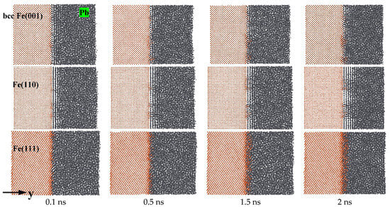 Figure 1 depicts the atomic diffusion behaviors of the equilibrated Fe(001)-Pb, Fe(110)-Pb, and Fe(111)-Pb solid–liquid interfaces at a temperature of T = 673 K. The snapshots were captured at 0.1 ns, 0.5 ns, 1.5 ns, and 2 ns, respectively. It can be observed that the phenomenon of atomic diffusion is accelerated with the extension of corrosion time on different crystal planes. However, the interfacial diffusion properties differ, indicating the presence of corrosion anisotropy. In the case of Fe(110), the pronounced ordering of liquid Pb is visible throughout the simulation time (2 ns). The ordering distribution of liquid Pb in contact with Fe(001) was relatively low, while the Fe(111) was free of ordering throughout the corrosion process. The diffusion of Fe atoms into liquid Pb occurred on all three crystal planes, indicating that dissolution corrosion occurred on all planes. Notably, the dissolution corrosion on the Fe(111) plane was significantly more pronounced than that observed on the Fe(110) and Fe(001) planes, and a uniform dissolution layer of Fe atoms appeared at the solid–liquid interface at 0.1 ns. Furthermore, the dissolution and diffusion of Fe atoms into the liquid Pb also occurred at the (110) and (001) planes, yet to a significantly lesser extent. In comparison, the (110) planes demonstrate the most robust resistance to dissolution corrosion, largely due to the pronounced interfacial delamination phenomenon, which facilitates a more pronounced degree of solid–liquid separation. The results of the calculations thus indicate that for Fe of bcc, dissolution corrosion was most susceptible to occur in the (111) plane, followed by the (001) plane, and that the (110) plane exhibited the most resistance to corrosion by liquid Pb.