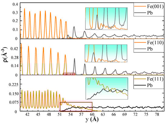 The fine-scale density profiles of the Fe(001)-Pb, Fe(110)-Pb, and Fe(111)-Pb at the end of the diffusion at 673 K.