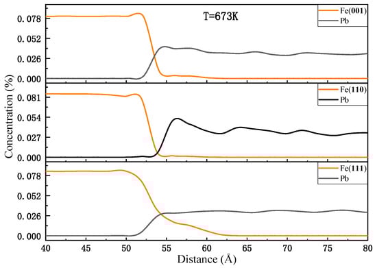 The snapshots at each moment permitted visualization of the high-temperature diffusion process at the solid–liquid interfaces. To further refine the analysis of the diffusion behavior of the atoms at the solid–liquid interface, fine-scale density profiles were calculated for the three crystal models. To obtain the fine-scale density profiles, the assembled models were sliced into a number of thin bins along the y-axis; the bin size was chosen to be 1/40th of the lattice constant. Figure 2 shows fine-scale density profiles of the Fe-Pb models with three crystal planes at 673 K. It can be observed that the densities of atoms at different crystal planes of the Fe bulk are arranged in a periodic pattern. The (110) crystal plane exhibits the widest interplanar distance and the loosest arrangement of density peaks. Followed by (001), and the density peaks are most tightly arranged in the (111) plane. It is notable that the density distribution of liquid Pb atoms at approximately 18 Å near the (110) and (001) planes also exhibits a distinct pattern of periodic peak distribution. As the distance from the crystal plane increases, the amplitude of the peaks gradually decreases until their disappearance, and the density distribution of Pb reverts to the typical liquid disorder. In addition, the density peak width, peak spacing, and oscillation period of the liquid Pb in contact with the (110) plane are nearly identical to those of the (110) plane itself. Furthermore, the crystal distribution characteristics are more pronounced in this area relative to those observed in the liquid Pb in contact with the (001) plane. Meanwhile, the density distribution of liquid Pb in contact with the (111) plane does not exhibit a periodic peak pattern. Instead, it clearly shows the mutual diffusion of Fe and Pb atoms at the solid–liquid interface. This suggests the presence of interfacial alloying, which is characterized by severe dissolution corrosion at the interface. Overlapping of the density peaks of Fe and Pb atoms also occurs at the (110) and (001) planes. However, the (110) plane demonstrates superior structural integrity, with less Fe diffusing into the liquid Pb and a shorter diffusion distance. The alloying layer is primarily the result of the dissolution of Fe atoms into liquid Pb. Due to the larger atomic radius of Pb (0.175 nm, 0.126 for Fe, and 0.124 for Ni), it is challenging for Pb atoms to penetrate the Fe crystal lattice without disrupting its structure. Therefore, the diffusion of Pb atoms into the Fe crystal occurs only when a sufficient quantity of Fe atoms is dissolved and the crystal surface contains a high density of defects.