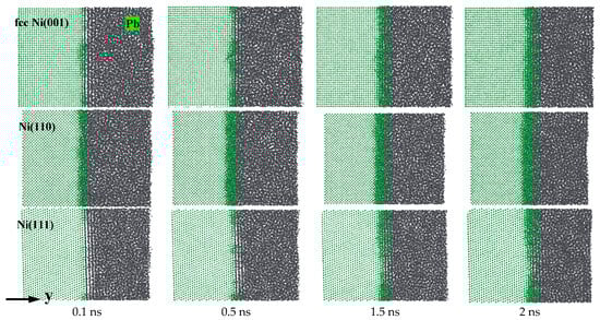 Figure 4 shows the snapshots of representative diffusion processes for Ni (001), (110), and (111)-Pb interfaces at T = 673 K. They were captured at 0.1 ns, 0.5 ns, 1.5 ns, and 2 ns, respectively. It can be observed intuitively that the diffusion of Ni atoms into liquid Pb is intensified with the increase in simulation time, especially for the (001) and (110) planes of Ni. The thickness of the diffusion layer varies significantly, which suggests that Ni with fcc crystal structure also exhibits anisotropy of dissolution corrosion in liquid Pb. The Ni(111)-Pb interface exhibited the least amount of diffusion of Ni atoms into liquid Pb, followed by the Ni(001)-Pb interface. In contrast, at the Ni(110)-Pb interface, severe diffusion of Ni atoms occurred, yet the growth of the thickness of the diffusion layer slowed down with the extension of the simulation time. By examining the trajectory files of the diffusion process, it can be observed that when the diffusion layer reaches a certain thickness, the number of Ni atoms dissolved on the side of the diffusion layer closest to the solid Ni is significantly higher than the number of Pb atoms. The large number of Ni atoms wrapped around the near surface of the solid Ni prevents the Pb atoms from interacting frequently with the surface of Ni. Consequently, the number of Pb atoms directly in contact with the solid Ni decreases compared to the initial moments. This results in a reduction in the observed dissolution rate of the solid Ni and a deceleration of the growth of the diffusion layer. Notably, the liquid Pb distribution at the Ni(001)-Pb and Ni(111)-Pb interfaces appears to be regularly stratified when viewed from the direction of the vertical x-axis, allowing the liquid Pb and solid Ni to separate from each other. As the solid Ni bulks are gradually corroded by liquid Pb, the layered structure of the liquid Pb is gradually covered by the filling of the diffusion layer, while no liquid Pb was observed to lie at the Ni(110)-Pb interface during the simulation time. The snapshots of the diffusion process demonstrate that Ni with fcc crystal structure exhibits the lowest dissolution rate at the (111) plane, followed by the (001) plane. In contrast, the (110) plane is the most vulnerable to corrosion by liquid Pb.