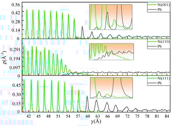 Figure 5 depicts the fine-scale density profiles of the Ni-Pb models with three crystal planes at 673 K for a simulation time of 0.1 ns. It can be observed that the atomic density distributions of Ni single crystals with different crystal planes all exhibit typical periodic peak arrangements, except that the height and peak distance of the peaks of different crystal planes are different (the heights of the peaks as follow: (110) plane: peak height = 1, d-spacing = 4, (001) plane: peak height = 2, d-spacing = 5, (111) plane: peak height = 3, d-spacing = 6). For the (111) plane, the peak distance is the widest, and the peaks have the highest amplitude of the three. The (001) plane has the next highest density peak amplitude, while the (110) plane has the lowest density peak amplitude, and the peaks are the most closely aligned. Therefore, the fine-scale density profiles characterize the arrangement of the various crystal planes of the crystal structure. Notably, the liquid Pb adjacent to the three crystal planes exhibits distinct structural characteristics. In the Ni(111)-Pb model, the liquid Pb exhibits an evident periodic density peak arrangement in the first six layers. As the distance from the solid–liquid interface increases, the amplitude of the peaks gradually diminishes until they disappear, transforming into the typical disorder-like distribution of liquid atoms. The distance of the density peaks in the first and second layers is comparable to that observed on the (111) plane. It can be inferred from the figure that Pb atoms have diffused into the (111) plane of Ni bulk. This is due to the detachment of Ni atoms from the original crystal surface, which results in the formation of vacancy defects within the (111) plane. This subsequently allows Pb atoms to diffuse along the defects into the interior of the Ni single crystal. However, the number of Ni and Pb atoms involved in interdiffusion is relatively limited, as indicated by the density map. The (001) plane is analogous to the (111) plane, and the liquid Pb adjacent to it also exhibits a periodic arrangement of density peaks. The amplitude of these peaks diminishes with increasing distance from the interface until they disappear. The amplitude of the peaks is relatively low, and the number of Pb atoms diffusing into the (001) plane is higher than that observed for the (111) plane. This indicates that the number of Ni atoms dissolved from the (001) plane to the liquid Pb side is relatively high. For the Ni(110)-Pb model, the most serious dissolution of Ni atoms to the liquid Pb side occurs at the interface. This process results in the destruction of the structural integrity of the (110) plane, thereby facilitating the diffusion of a considerable number of Pb atoms into the Ni lattice. The interdiffusion layer can attain a thickness of 11.8 Å, which suggests that dissolution corrosion occurring at the (110) plane is the most significant. Furthermore, the atomic density distribution of liquid Pb in close proximity to this plane is most consistent with the typical liquid distribution pattern, namely the disorder-like distribution.