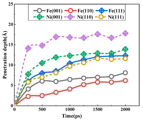 Figure 6 depicts the diffusion depth of bcc iron and fcc nickel atoms on the low-index crystal plane over a 2 ns simulation time. It can be observed that the diffusion depth is obviously deepened with the increase in time. Furthermore, the growth rate of each curve exhibits a consistent trend. The fastest increase is observed during the initial 250 ps, followed by a gradual deceleration in the subsequent 250–500 ps interval. The slowest growth rate is evident during the 500–2000 ps period. As previously discussed, the increase in corrosion time resulted in the aggregation of Fe, Ni, and Pb atoms at the solid–liquid interface, forming a diffusion layer that grew in thickness over time. This diffusion layer, situated in proximity to the solid side, exhibited two distinct characteristics: firstly, it continued to undergo diffusion, and secondly, it served as a barrier, preventing a large influx of Pb atoms from surging to the solid single crystal. Consequently, the dissolution rate is at its maximum at the initial stage of solid–liquid interfacial contact. As the diffusion layer increases, the dissolution rate declines, and the growth rate of the diffusion depth slows down. As illustrated in Figure 6, for bcc Fe, the Fe atomic penetration depth of the (111) plane is the greatest among the three planes, with a value of approximately 12.3 Å. The depth values for the (001) and (110) planes are 8.1 Å and 6.2 Å, respectively. With regard to the fcc Ni, the most significant dissolution corrosion phenomenon is observed at the (110) plane, with a depth of approximately 17.8 Å. This is followed by the (001) plane, which exhibits a depth of 13.9 Å, and the (111) plane, which displays a depth of 11.6 Å.