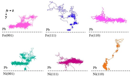 Table 3 shows the values of the interplanar distance for bcc and fcc crystal structures. It can be observed that value and corrosion resistance exhibit a positive correlation, with the larger the interplanar distance, the stronger the corrosion resistance of the plane. The mechanism by which the interplanar distance affects the corrosion resistance of the material can be observed by examining the trajectories of the atoms during the diffusion process (Figure 7). The typical trajectories of liquid Pb atoms near the planes with larger interplanar distance are random motions in the direction parallel to the solid–liquid interface. In contrast, the typical trajectories of liquid Pb atoms in contact with the planes with a smaller interplanar distance tend to be random motions in the direction perpendicular to the solid–liquid interface. This diffusion process elucidates the underlying mechanism responsible for the observed differences in corrosion resistance of different crystal surfaces at the atomic scale.
