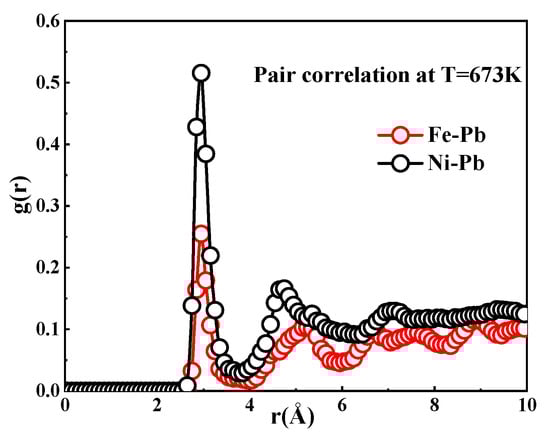 In addition, the corrosion resistance of a material is closely related to the type of element, in addition to the crystal structure. Figure 8 shows the pair distribution functions [] of Fe and Ni atoms in liquid Pb at 673 K, respectively. The curves describe the structuring of the liquid Pb around these atoms. The coordination numbers of Ni are higher than those of Fe, as demonstrated by the integration of the first peaks in the curves. Therefore, it can be inferred that the element Ni is more susceptible to dissolution in Pb than the element Fe. These data demonstrate that the corrosion of materials is the result of a combination of the intrinsic structure of the material and the specific chemical composition of the elements present.