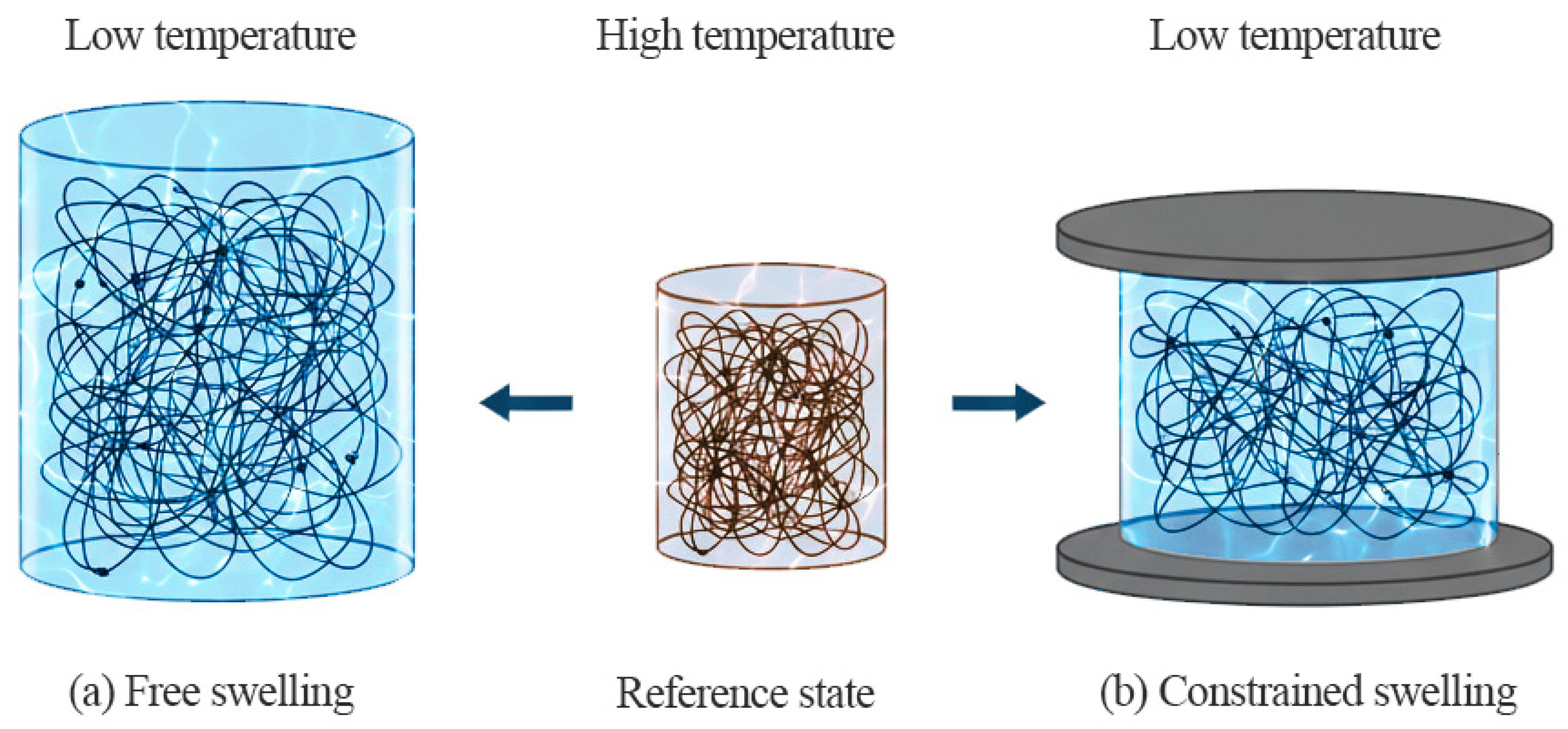 - Mazaheri, H.; Baghani, M.; Naghdabadi, R. Inhomogeneous and homogeneous swelling behavior of temperature-sensitive poly-(N-isopropylacrylamide) hydrogels. J. Intell. Mater. Syst. Struct. 2015, 27, 324–336. [Google Scholar] [CrossRef]
