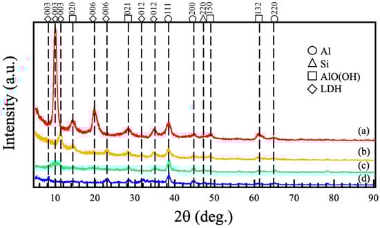 XRD patterns of films prepared on ADC12 substrates via (a) steam coating at 140 °C for 12 h using 1.0 M Mg(NO3)2 aqueous solution, followed by immersion in 1.0 M aqueous solutions of (b) Na2MoO4·2H2O, (c) Na3VO4, and (d) H3PO4.