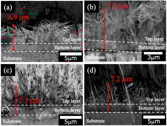 Figure 3 shows the cross-sectional SEM images of the films prepared on ADC12 substrates via (Figure 3a) steam coating at 140 °C for 12 h using 1.0 M Mg(NO3)2 aqueous solution, followed by immersion in 1.0 M aqueous solutions of (Figure 3b) Na2MoO4·2H2O, (Figure 3c) Na3VO4, and (Figure 3d) H3PO4. The thickness of all films was estimated to be (Figure 3a) 6.9 μm, (Figure 3b) 7.3 μm, (Figure 3c) 7.3 μm, and (Figure 3d) 7.2 μm, respectively. The films exhibited no significant change in thickness before and after immersion. This finding suggests that immersion in the Na2MoO4·2H2O, Na3VO4, and H3PO4 solutions did not substantially alter the morphological integrity or structural dimensions of the films. The cross-sectional SEM images revealed that all films exhibited a double-layer structure. The bottom layer demonstrated a dense morphology, whereas the top layer contained gaps within its layered structure. A plate-like morphology was evident in the top layer, consistent with the SEM images shown in Figure 2. The SEM and XRD results conclusively identify the top layer as LDH and the underlying layer as AlO(OH).