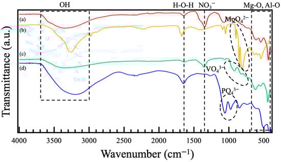 FT-IR spectra of films prepared on ADC12 substrates via (a) steam coating at 140 °C for 12 h using 1.0 M Mg(NO3)2 aqueous solution, followed by immersion in 1.0 M aqueous solutions of (b) Na2MoO4·2H2O, (c) Na3VO4, and (d) H3PO4.
