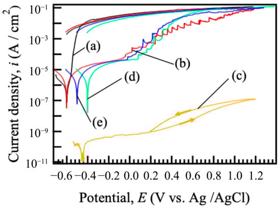 Cyclic potentiodynamic polarization curves of (a) bare ADC12 and films prepared on ADC12 substrates via (b) steam coating at 140 °C for 12 h using 1.0 M Mg(NO3)2 aqueous solution, followed by immersion in 1.0 M aqueous solutions of (c) Na2MoO4·2H2O, (d) Na3VO4, and (e) H3PO4.