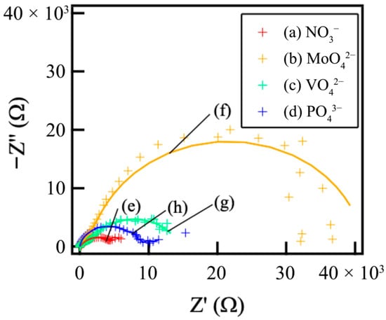 Nyquist plots of films prepared on ADC12 substrates via (a) steam coating at 140 °C for 12 h using 1.0 M Mg(NO3)2 aqueous solution, followed by immersion in 1.0 M aqueous solutions of (b) Na2MoO4·2H2O, (c) Na3VO4, and (d) H3PO4, and fitting results of Nyquist plots of films prepared on ADC12 substrates via (e) steam coating at 140 °C for 12 h using 1.0 M Mg(NO3)2 aqueous solution, followed by immersion in 1.0 M aqueous solutions of (f) Na2MoO4·2H2O, (g) Na3VO4, and (h) H3PO4.