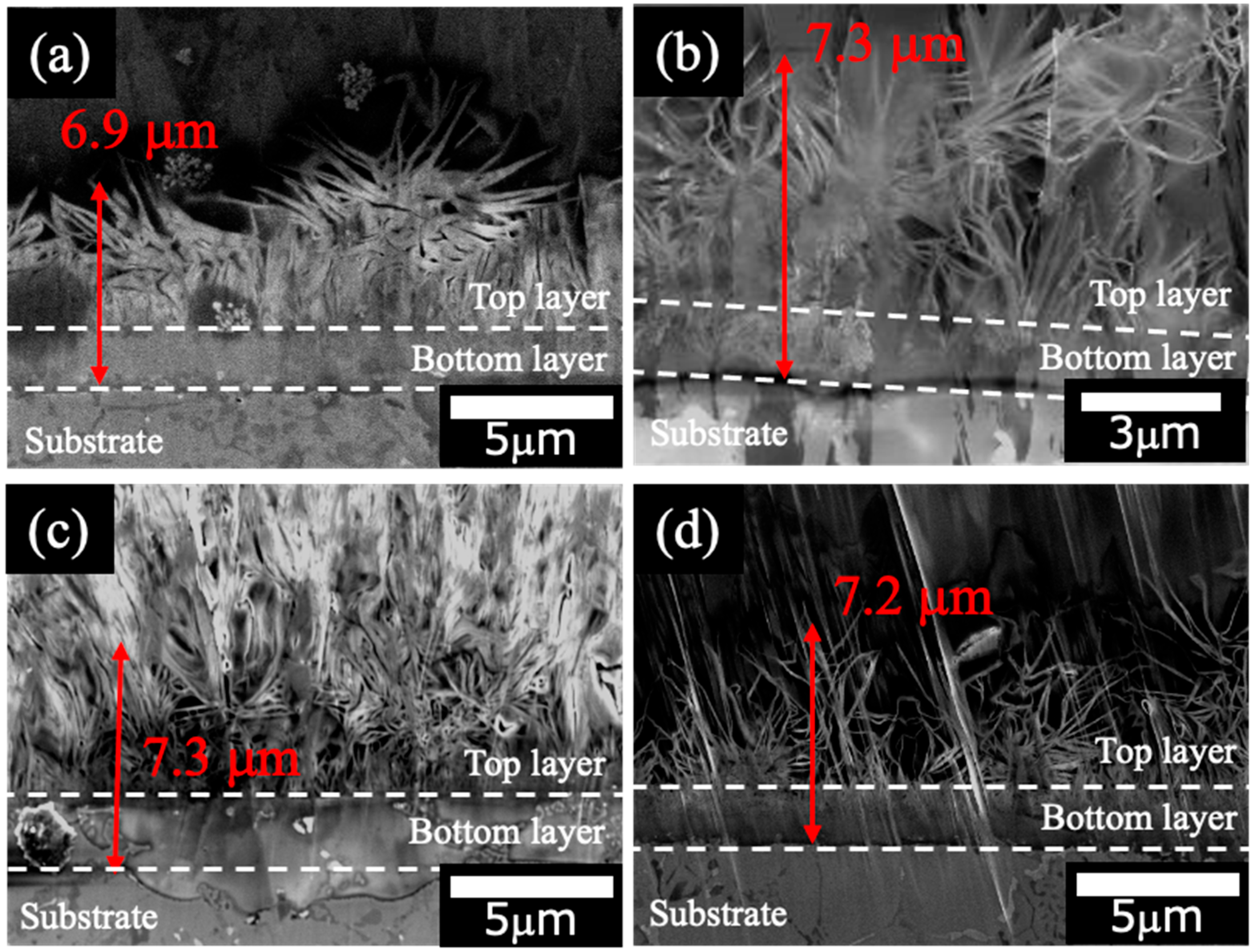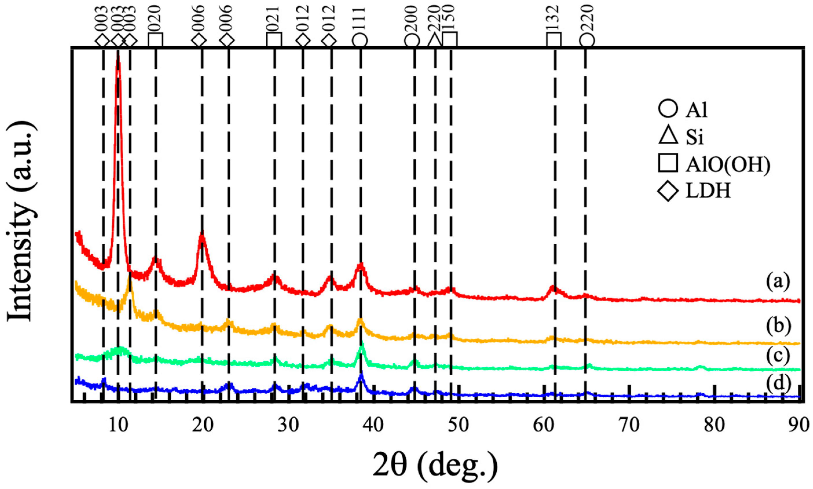 3.2. Surface and Cross-Sectional Morphologies of Mg–Al LDH Films