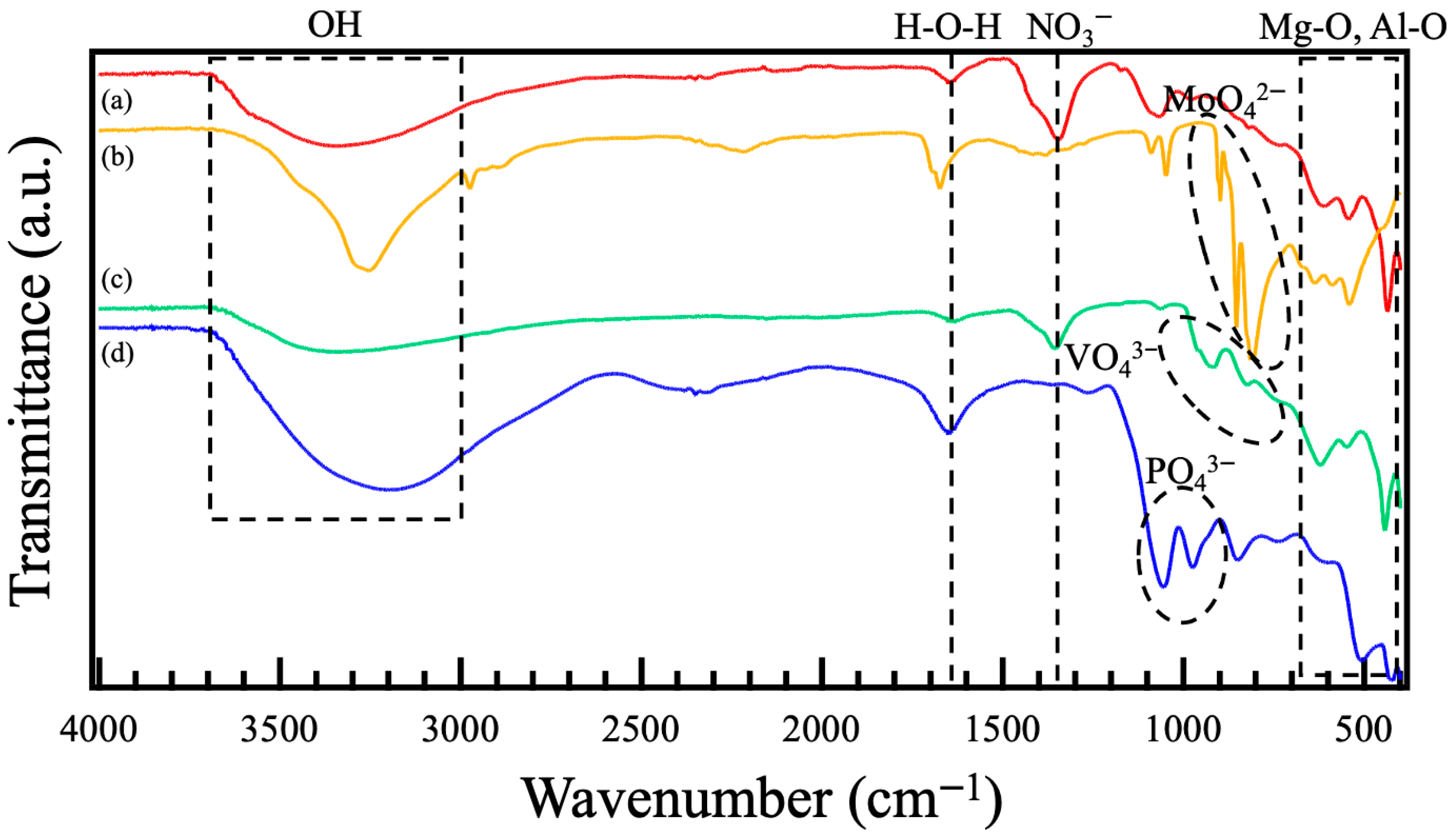 - Menetrier, M.; Han, K.S.; Guerlou-Demourgues, L.; Delmas, C. Vanadate-Inserted Layered Double Hydroxides: A51V NMR Investigation of the Grafting Process. Inorg. Chem. 1997, 36, 2441–2445. [Google Scholar] [CrossRef]