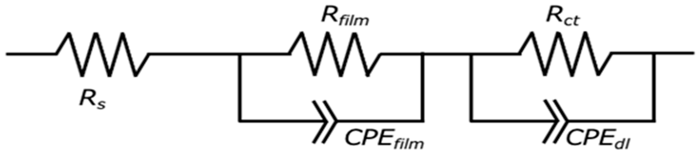 | Samples | Rs (Ω·cm2) | Rfilm (Ω·cm2) | CPEfilm (Ω−1·sn·cm−2) | Rct (Ω·cm2) | CPEdl (Ω−1·sn·cm−2) |