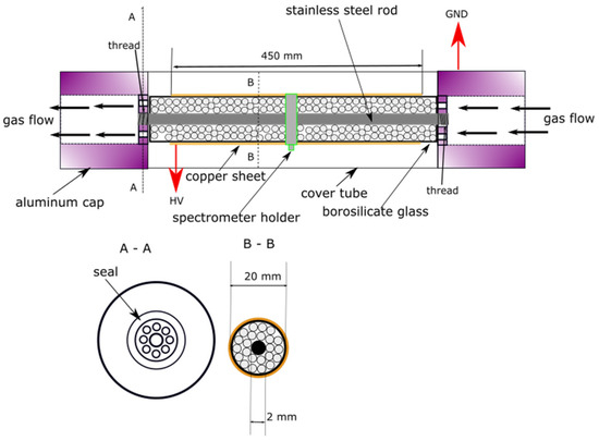 The schematic diagram of the DBD-PB reactor used in this study. (A-A) cross section of the holding head of the reactor, (B-B) cross section of the main part of the reactor.