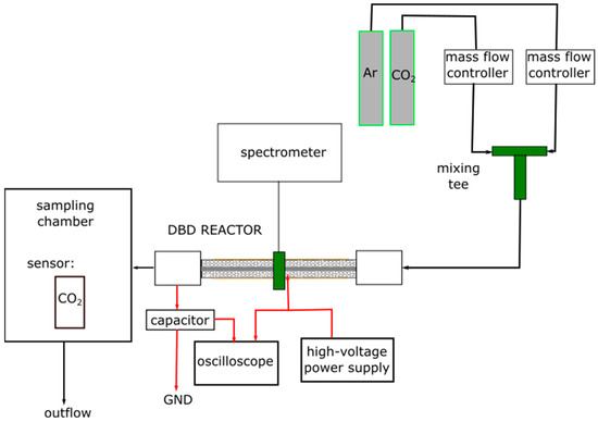 The carbon dioxide was diluted in argon to reach a target CO2 concentration of 2500 ppm. Mass flow controllers were used to precisely regulate the flow rates of all gases. Specifically, CO2 flow was controlled by a model SFC6000D-50slm (Sensirion AG, Stäfa, Switzerland), and argon flow was controlled by a model GCR-C9KA-BA30 (Vögtlin Instruments GmbH, Muttenz, Switzerland). A series of experiments was conducted at argon flow rates of 3, 5, and 7 dm3/min. The dilution ratio remained constant for all experiments. The gas streams were introduced into a tee-connector for subsequent mixing. The resulting gas mixture was then directed to the DBD-PB reactor, operating at atmospheric pressure. After the DBD-PB reactor, the outlet gas was sent to a sampling chamber, and the concentrations of CO2 and CO were assessed by the measuring system for subsequent analysis [35]. It consisted of a CO2 sensor (SparkFun SCD41 Qwii SEN-22396, Niwot, CO, USA) and a CO sensor (series SEN04xx, DFRobot, Shanghai, China). These sensors provided rapid and straightforward measurements, which were validated using gas chromatography (GC-2014, Shimadzu, Kyoto, Japan).