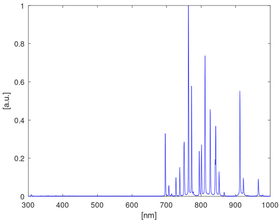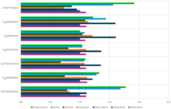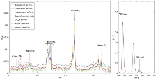 Plasma optical emission spectroscopy was performed using a spectrometer operating in the spectral range of 210–1080 nm (10083CAH apparatus, Hamamatsu Photonics, Hamamatsu, Japan). Preprocessing of spectral data was performed using SpectraGryph version 1.2.16.1 software (Dr. Friedrich Menges, Oberstdorf, Germany). Qualitative analysis was performed utilizing custom scripts in the GNU environment. The measurement methodology was as follows: For each bed material, researchers first acquired a dark spectrum (high-voltage power supply off) and then acquired a reference spectrum of pure Ar plasma at 3 dm3/min flow. Then, spectra were acquired operating on an Ar/CO2 mixture (2500 ppm CO2 in Ar) at flows of 3, 5, and 7 dm3/min. The dark spectrum was subtracted from both reference (Ar) and measurement (Ar/CO2) spectra before further processing. All observed plasma emissions were dominated by argon lines in the 700–1000 nm range (Figure 3). All obtained spectra were normalized using the maximum value corresponding to the 763.5 nm Ar* line.